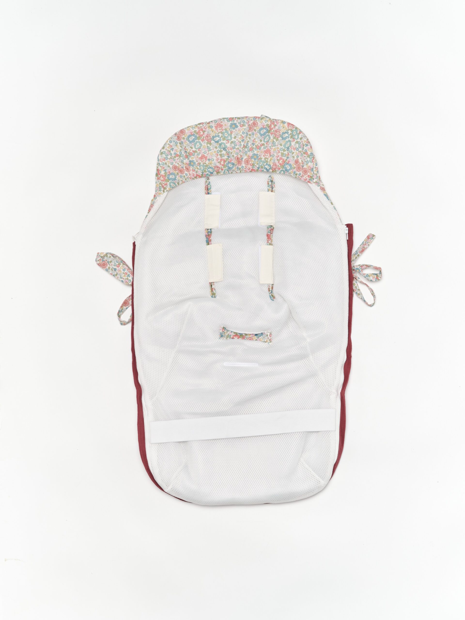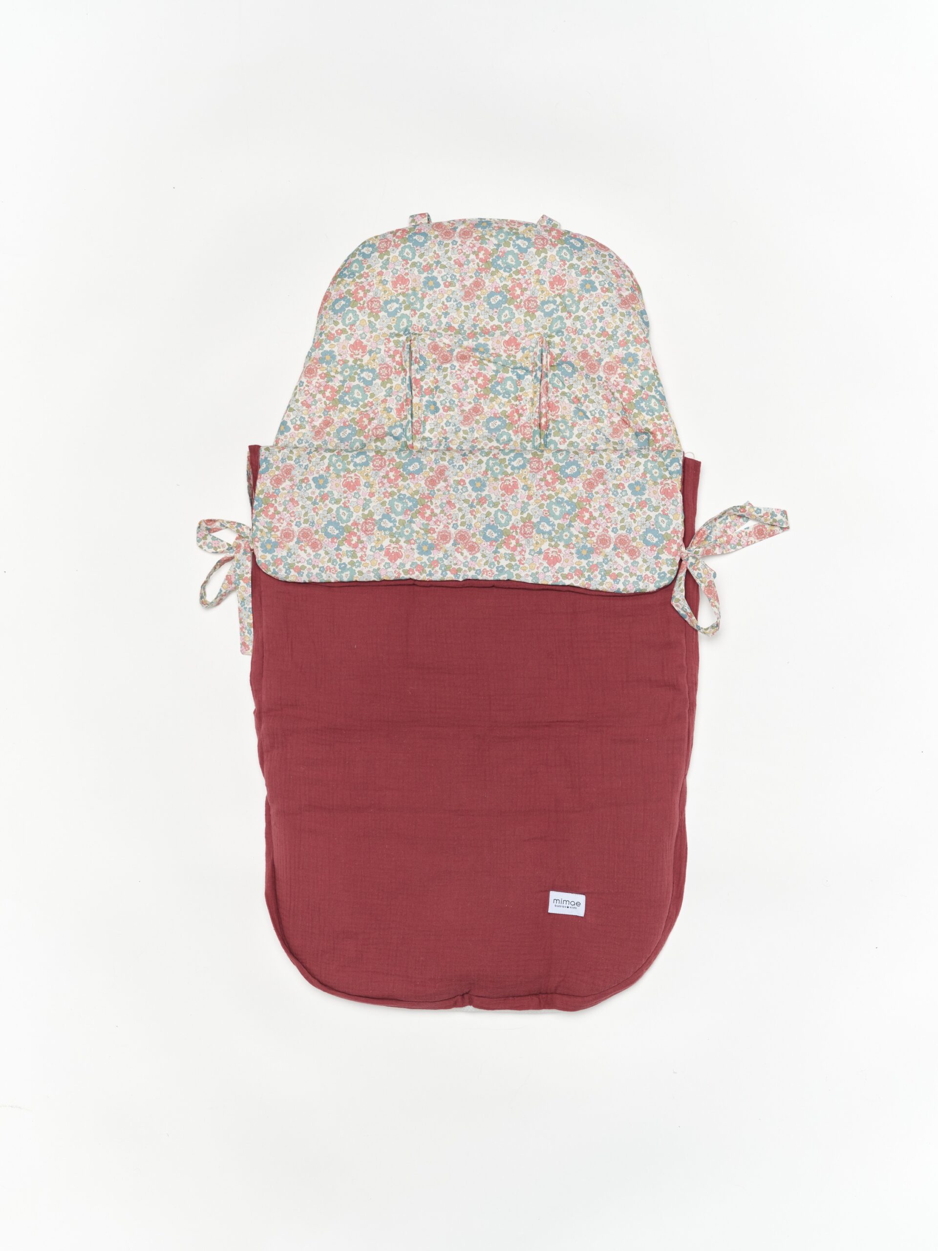 Saco universal para silla de paseo. Acolchado con una guata efecto pluma, el saco es totalmente extraíble mediante 2 cremalleras, para que pueda usarse como colchoneta los meses más cálidos. Parte trasera en Maya 3D, un tejido acolchado y transpirable. Agarre mediante gomas, vueltas y lazos. Confeccionado en estampado Alize y bambula granate.