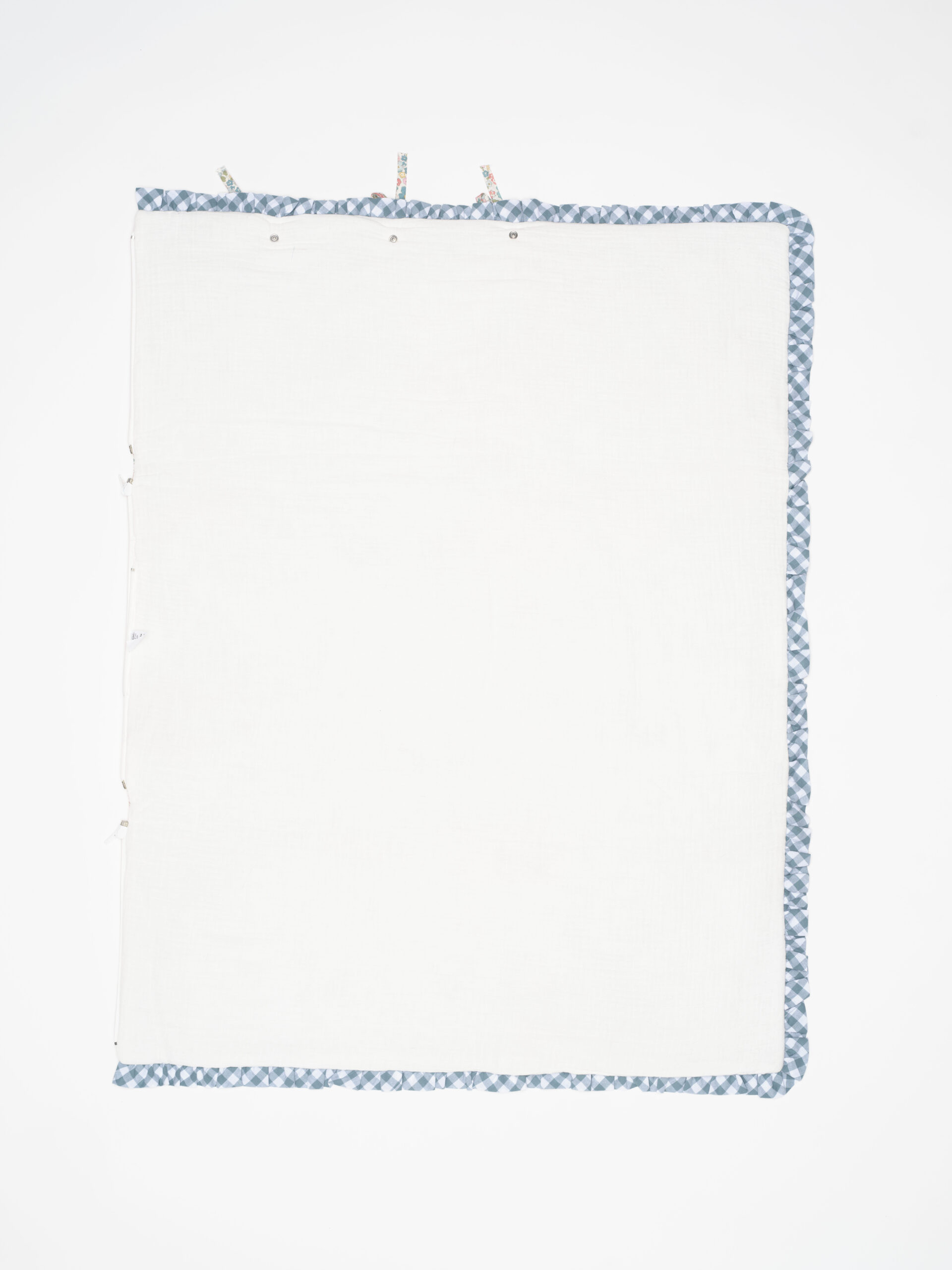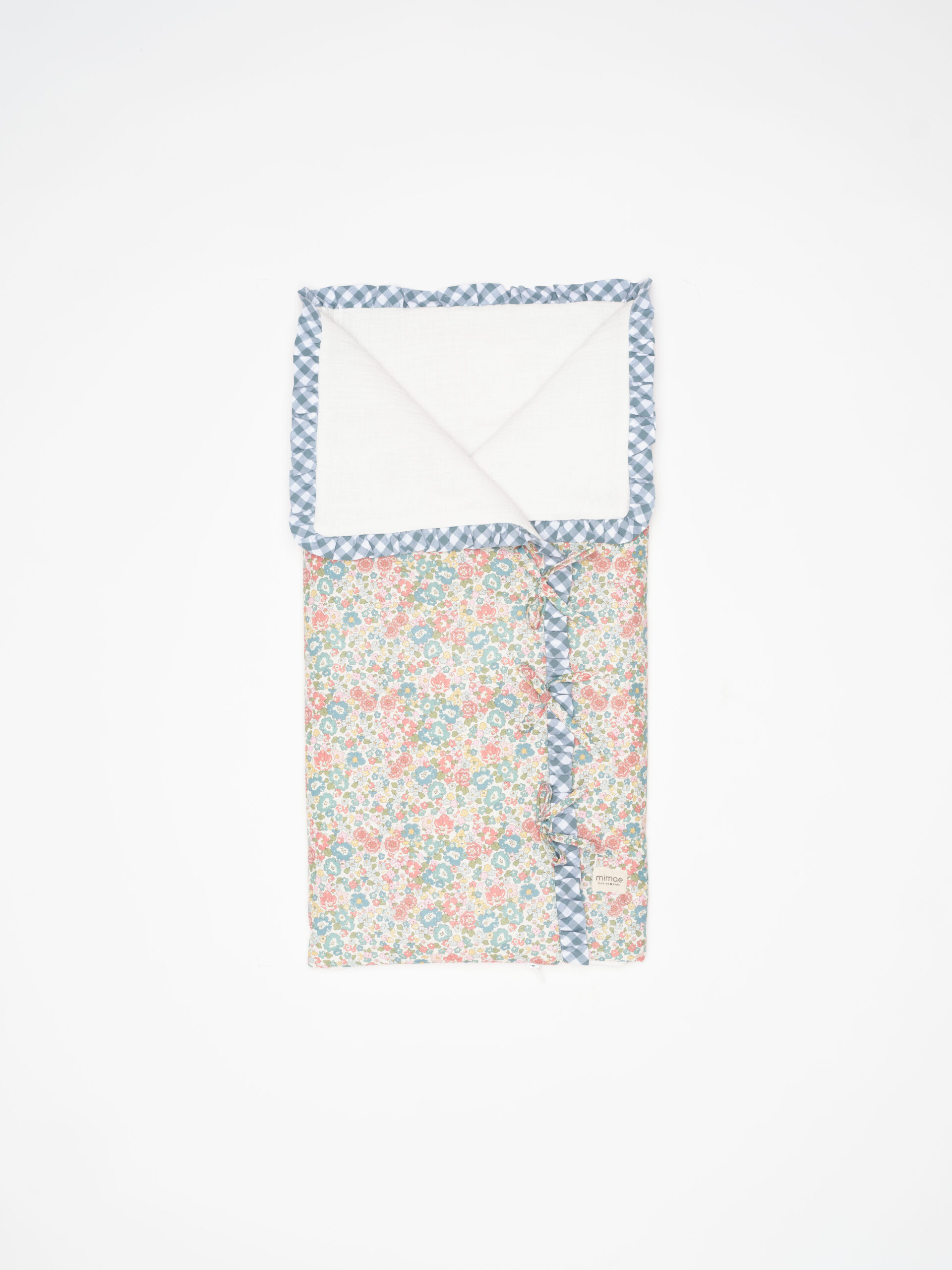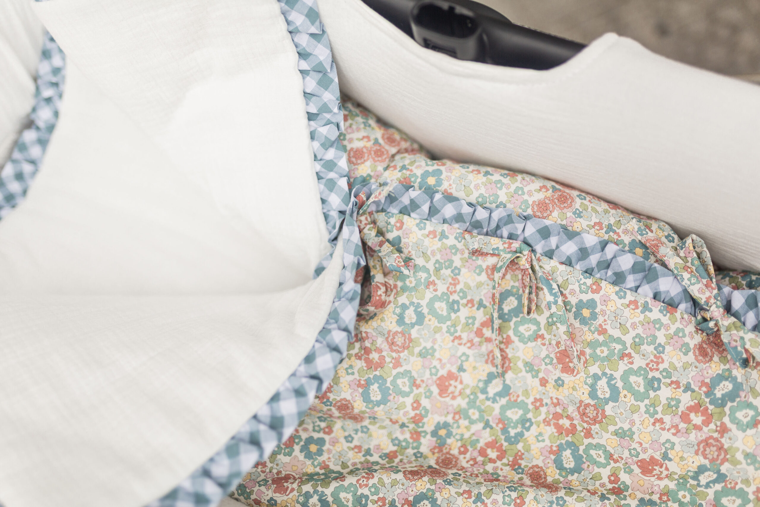 Saco capazo de bambula Alize con volante vichy menta.  Ideal para los primeros paseos en el capazo y para  arropar a tu bebé en la cuna o cuando lo tengas en los brazos. Se puede utilizar como arrullo o también se puede utilizar como mantita. Recomendaciones de lavado: Se puede lavar a mano o a máquina. Para lavadora elegir programa delicado con agua fría máx 30º y centrifugado suave. No utilizar secadora.