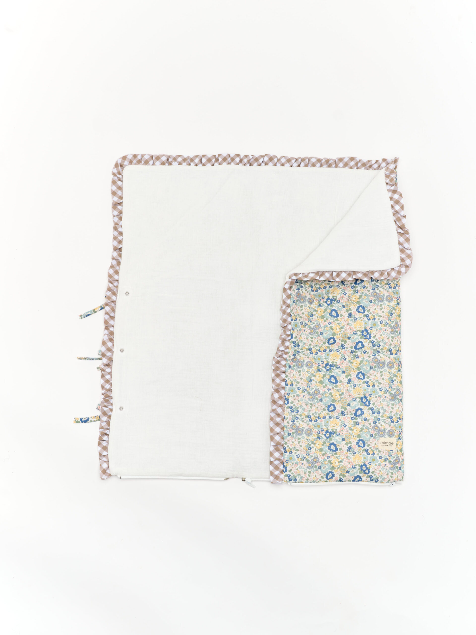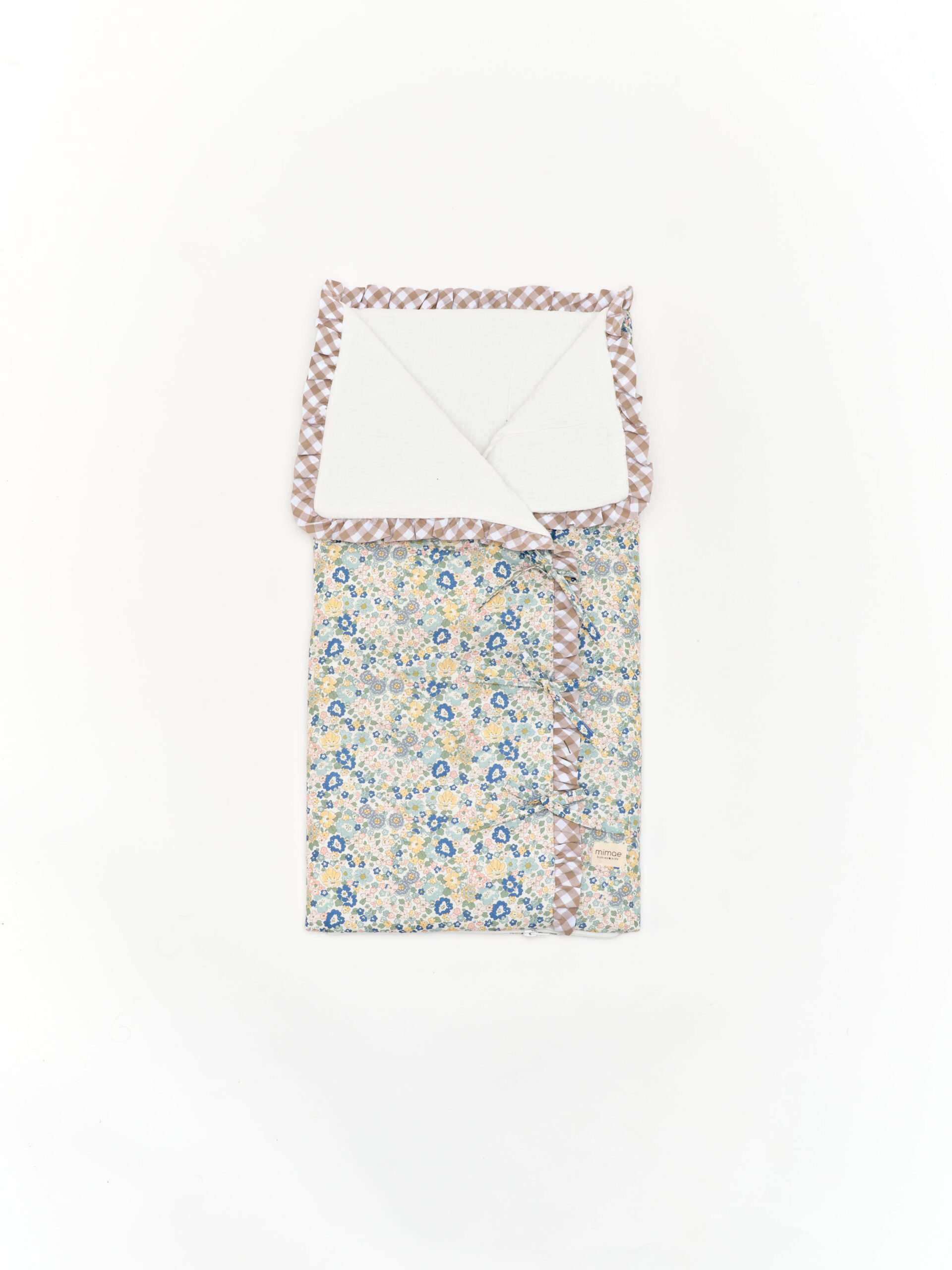 Saco capazo de bambula Mauri con volante vichy beige. Ideal para los primeros paseos en el capazo y para arropar a tu bebé en la cuna o cuando lo tengas en los brazos. Se puede utilizar como arrullo o también se puede utilizar como mantita. Recomendaciones de lavado: Se puede lavar a mano o a máquina. Para lavadora elegir programa delicado con agua fría máx 30º y centrifugado suave. No utilizar secadora.