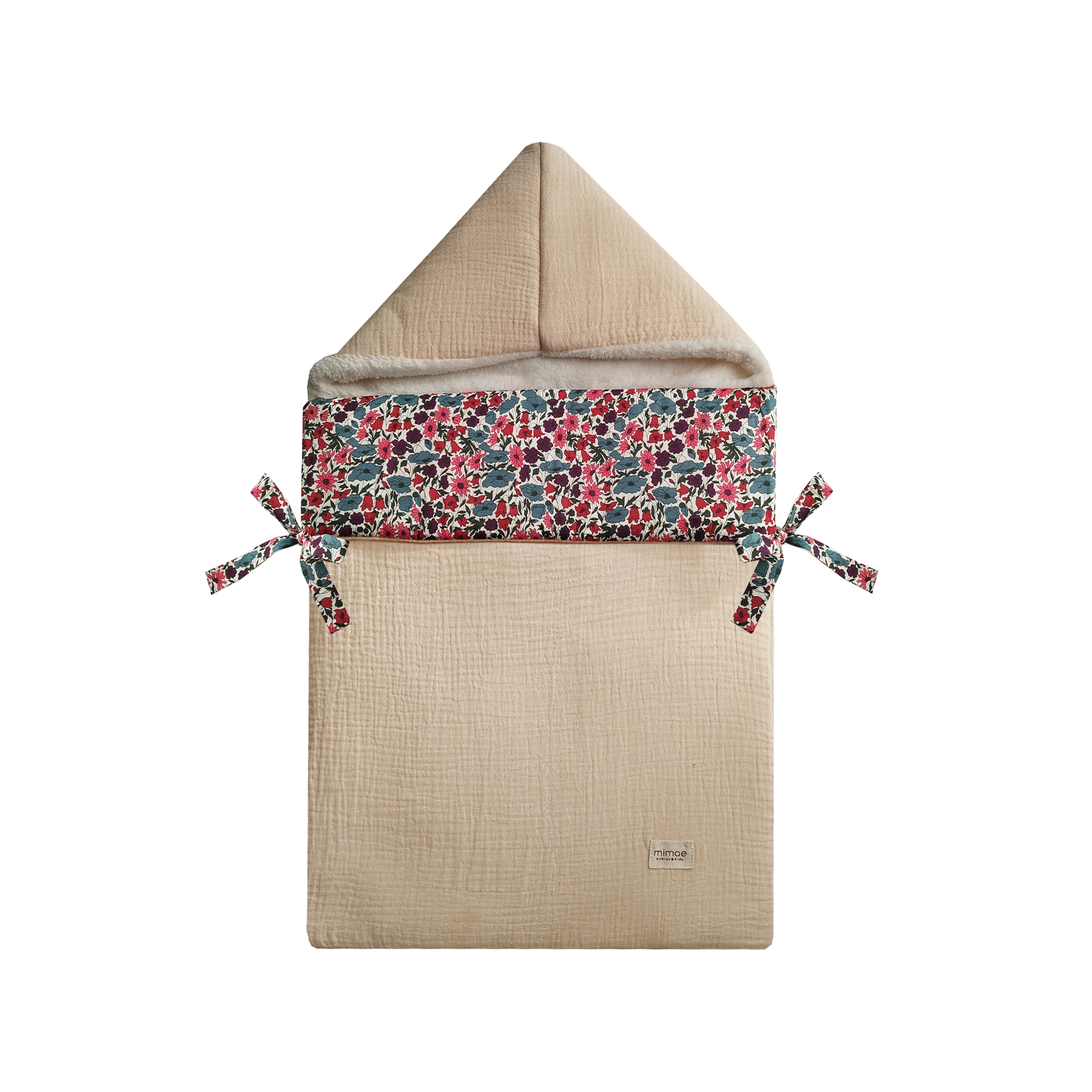 Saco de Capazo de invierno combinando Liberty Bera y Bambula Ecru, forrado con suave pelo tipo polar crudo. Tiene cremallera en el lateral par poder meter facilmente al bebe.