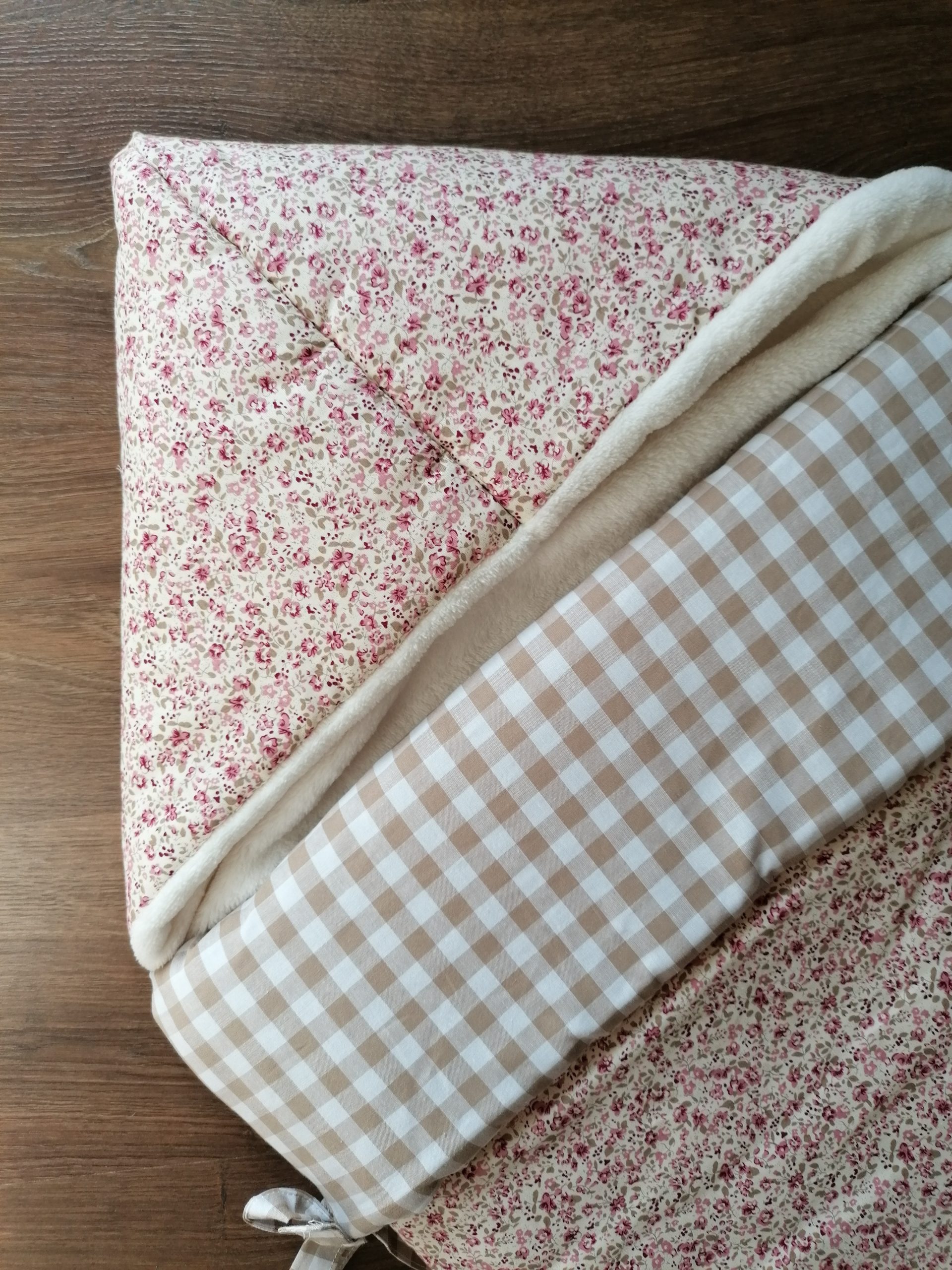 Saco de Capazo de invierno combinando Liberty Nikole y Vichy Beige, forrado con suave pelo tipo polar crudo. Tiene cremallera en el lateral par poder meter facilmente al bebe.