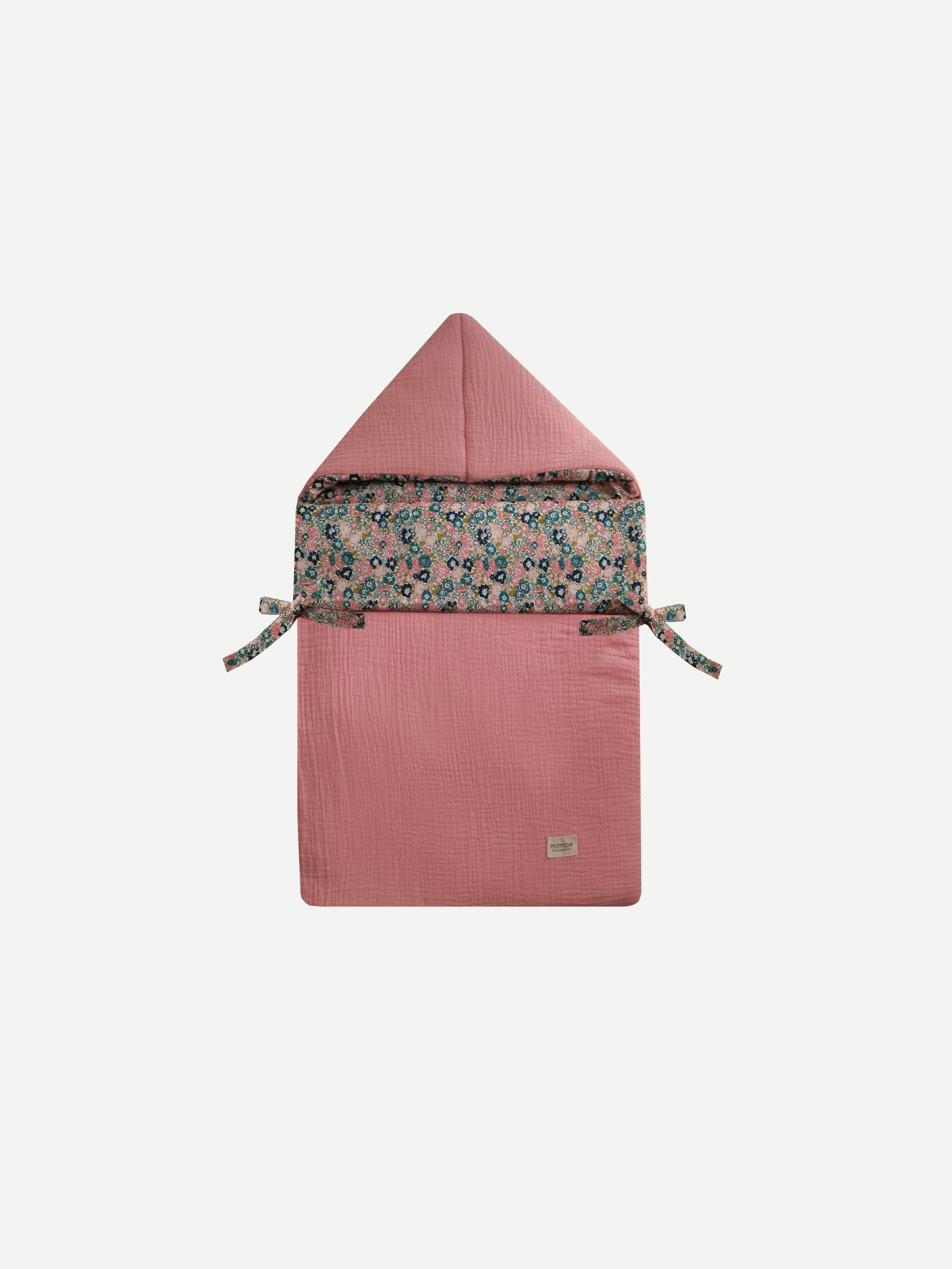 Saco para capazo o cuco universal. Acolchado y mullidito tiene una guata de grosor medio, está confeccionado en tejidos 100% algodón para mantener bien la temperatura. Tiene una cremallera lateral para poder meter a nuestro bebé cómodamente, y dos lazos decorativos. Saco de capazo combinado, el exterior esta confeccionado en Bambula Rosa, la cabeza y la vuelta en estampado Ane. Interior forrado con algodón orgánico.