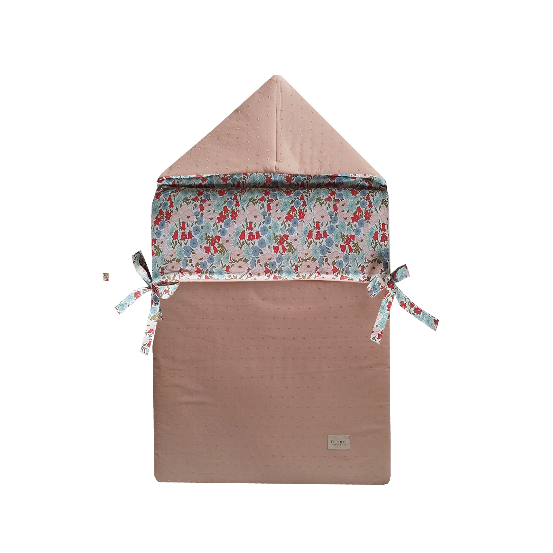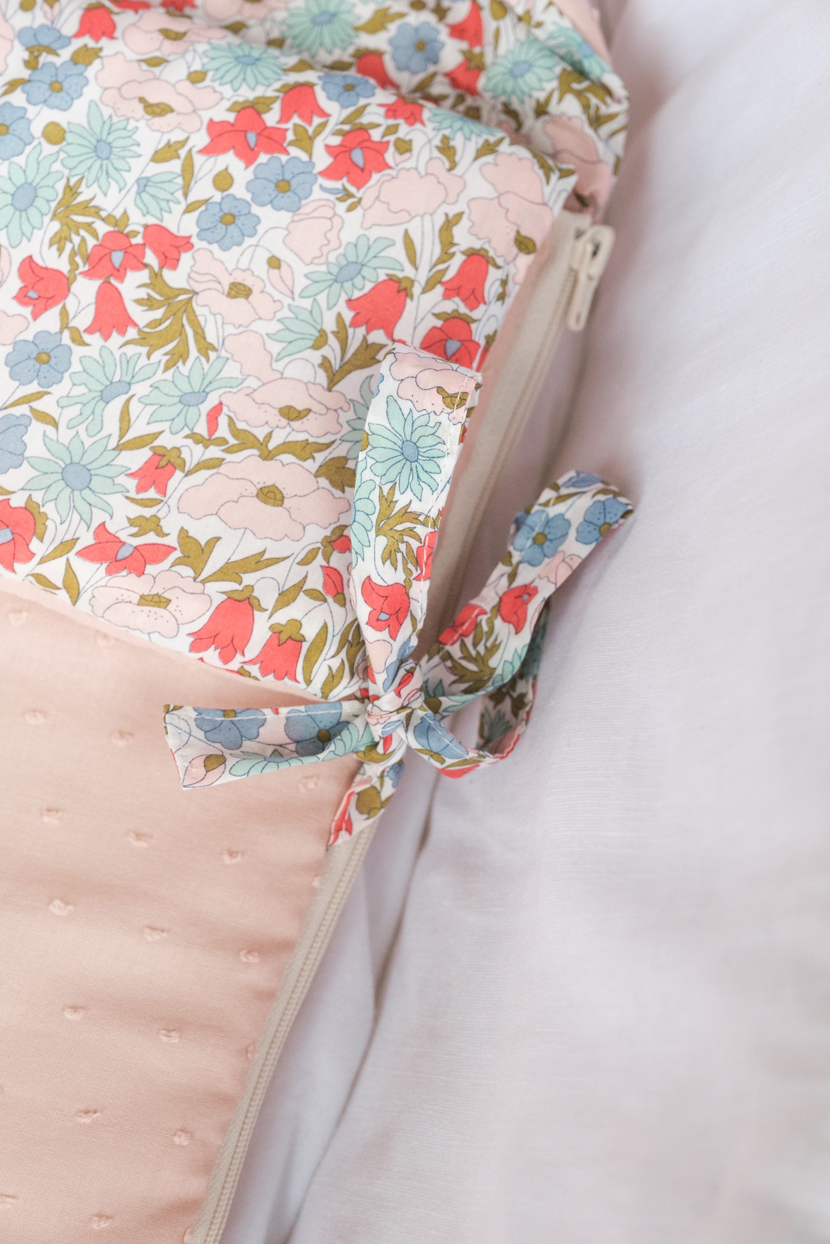 Saco para capazo o cuco universal. Acolchado y mullidito tiene una guata de grosor medio, está confeccionado en tejidos 100% algodón para mantener bien la temperatura. Tiene una cremallera lateral para poder meter a nuestro bebé cómodamente, y dos lazos decorativos. Saco de capazo combinado, el exterior esta confeccionado en Plumeti rosa , la cabeza y la vuelta en Liberty Lucía. Interior forrado con algodón orgánico. Estamapado Liberty London Original, diseño by Lucía Bárcena.