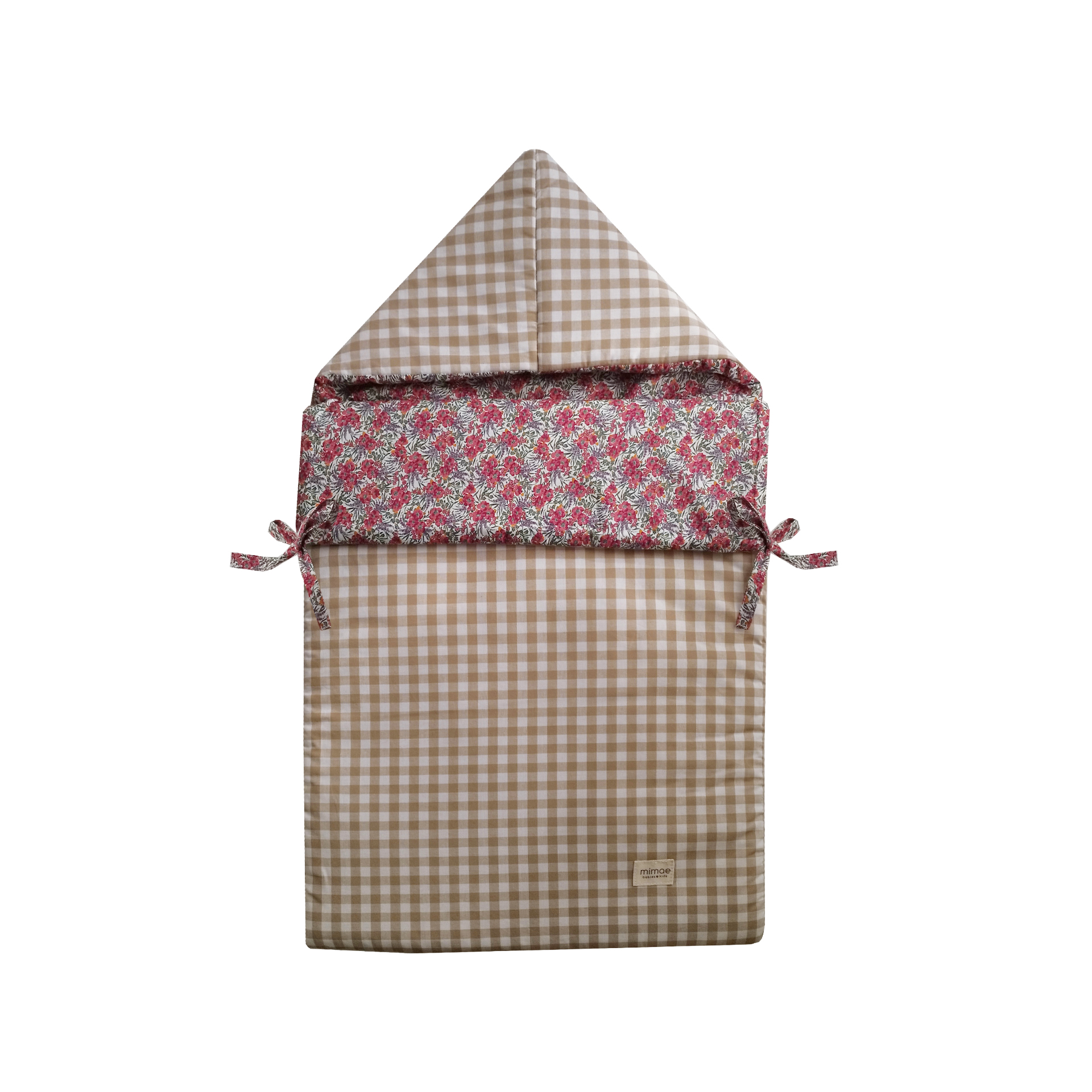 Saco para capazo o cuco universal. Acolchado y mullidito tiene una guata de grosor medio, está confeccionado en tejidos 100% algodón para mantener bien la temperatura. Tiene una cremallera lateral para poder meter a nuestro bebé cómodamente, y dos lazos decorativos. Saco de capazo combinado, el exterior esta confeccionado en Vichy beige, la cabeza y la vuelta en Liberty Malen. Interior forrado con algodón orgánico.