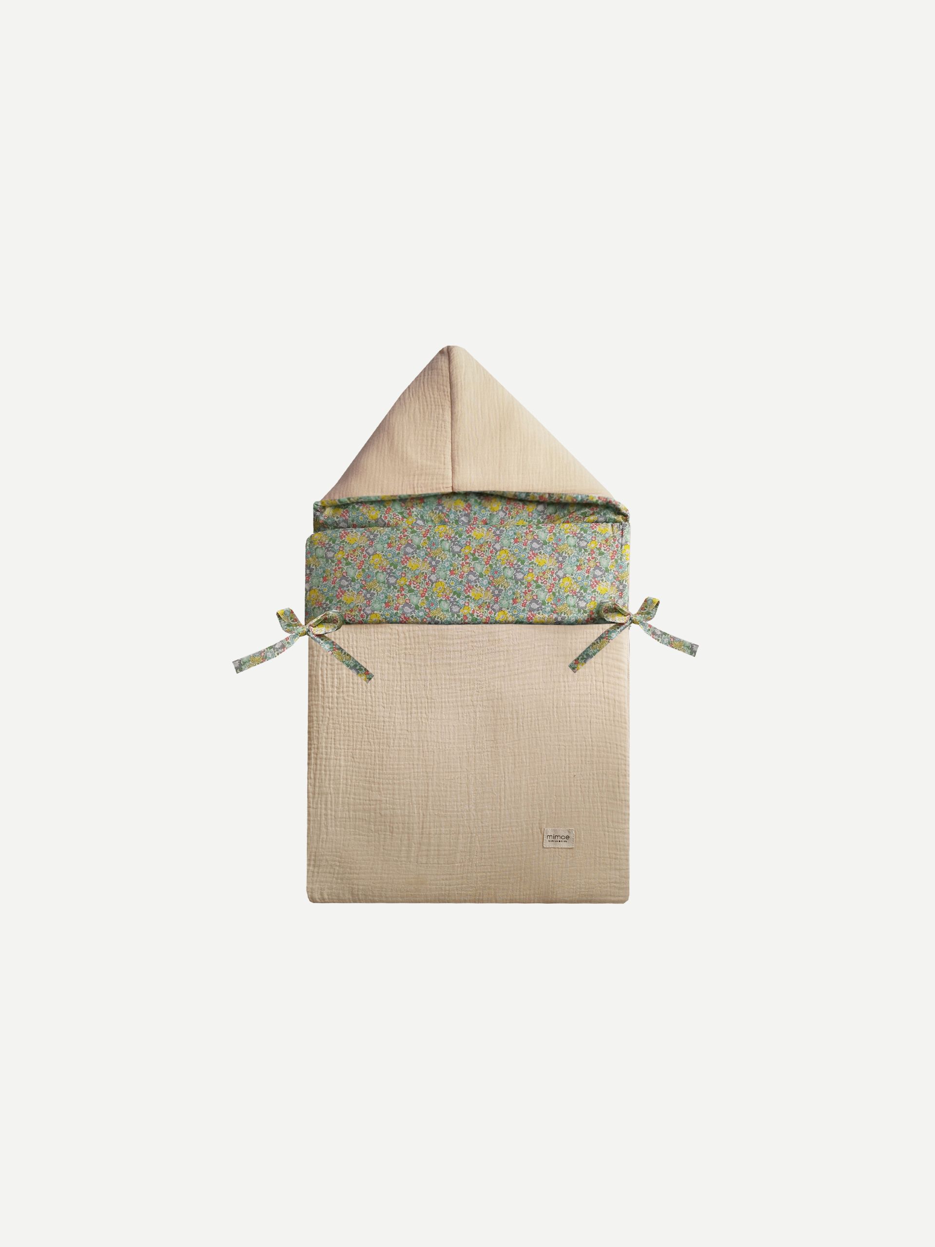 Saco para capazo o cuco universal. Acolchado y mullidito tiene una guata de grosor medio, está confeccionado en tejidos 100% algodón para mantener bien la temperatura. Tiene una cremallera lateral para poder meter a nuestro bebé cómodamente, y dos lazos decorativos. Saco de capazo combinado, el exterior esta confeccionado en bambula de algodón Ecru, la cabeza y la vuelta en Liberty Martine. Interior forrado con algodón orgánico.