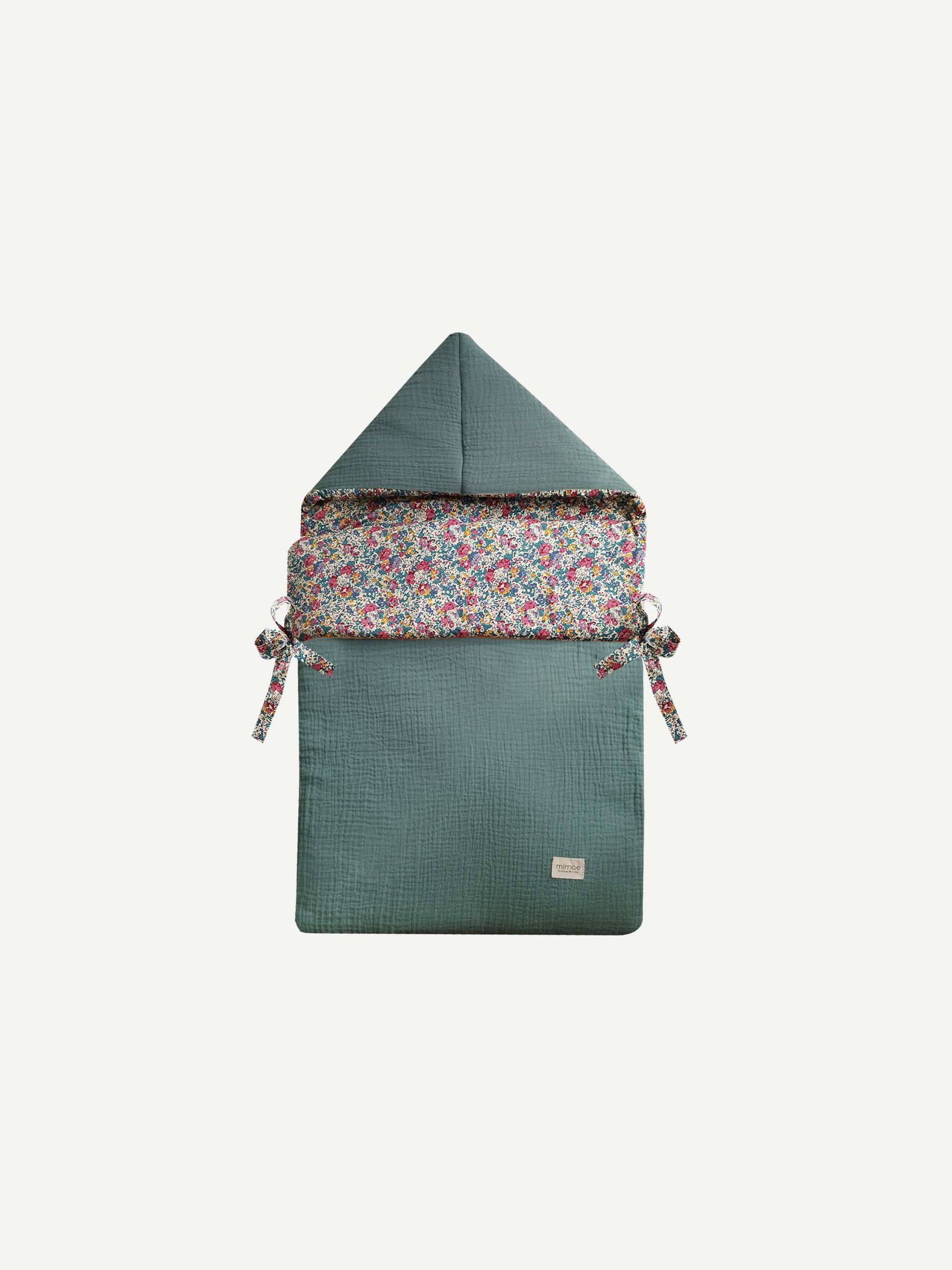 Saco para capazo o cuco universal. Acolchado y mullidito tiene una guata de grosor medio, está confeccionado en tejidos 100% algodón para mantener bien la temperatura. Tiene una cremallera lateral para poder meter a nuestro bebé cómodamente, y dos lazos decorativos. Saco de capazo combinado, el exterior esta confeccionado en Bambula Menta, la cabeza y la vuelta en Liberty Matilda. Interior forrado con algodón orgánico.