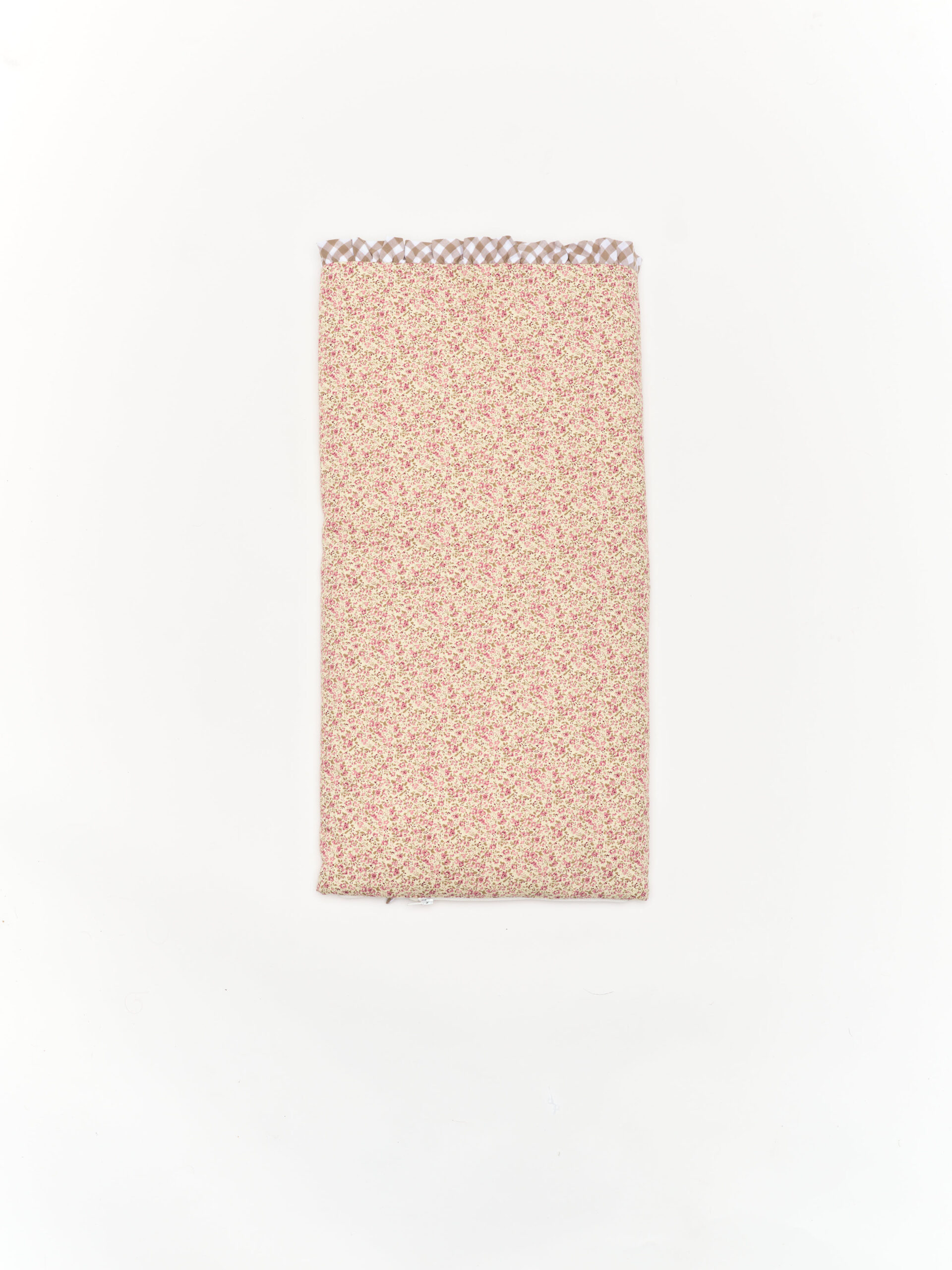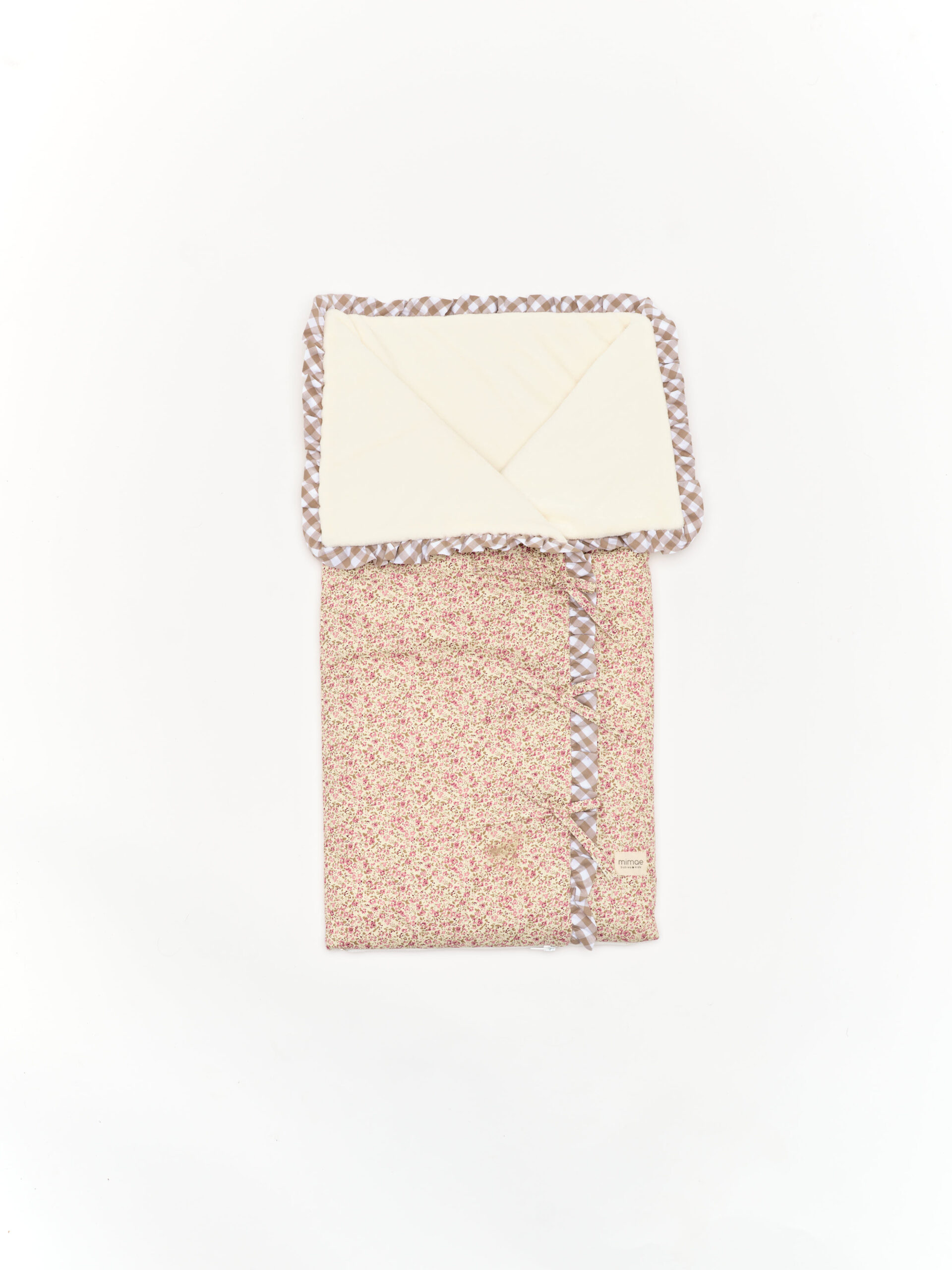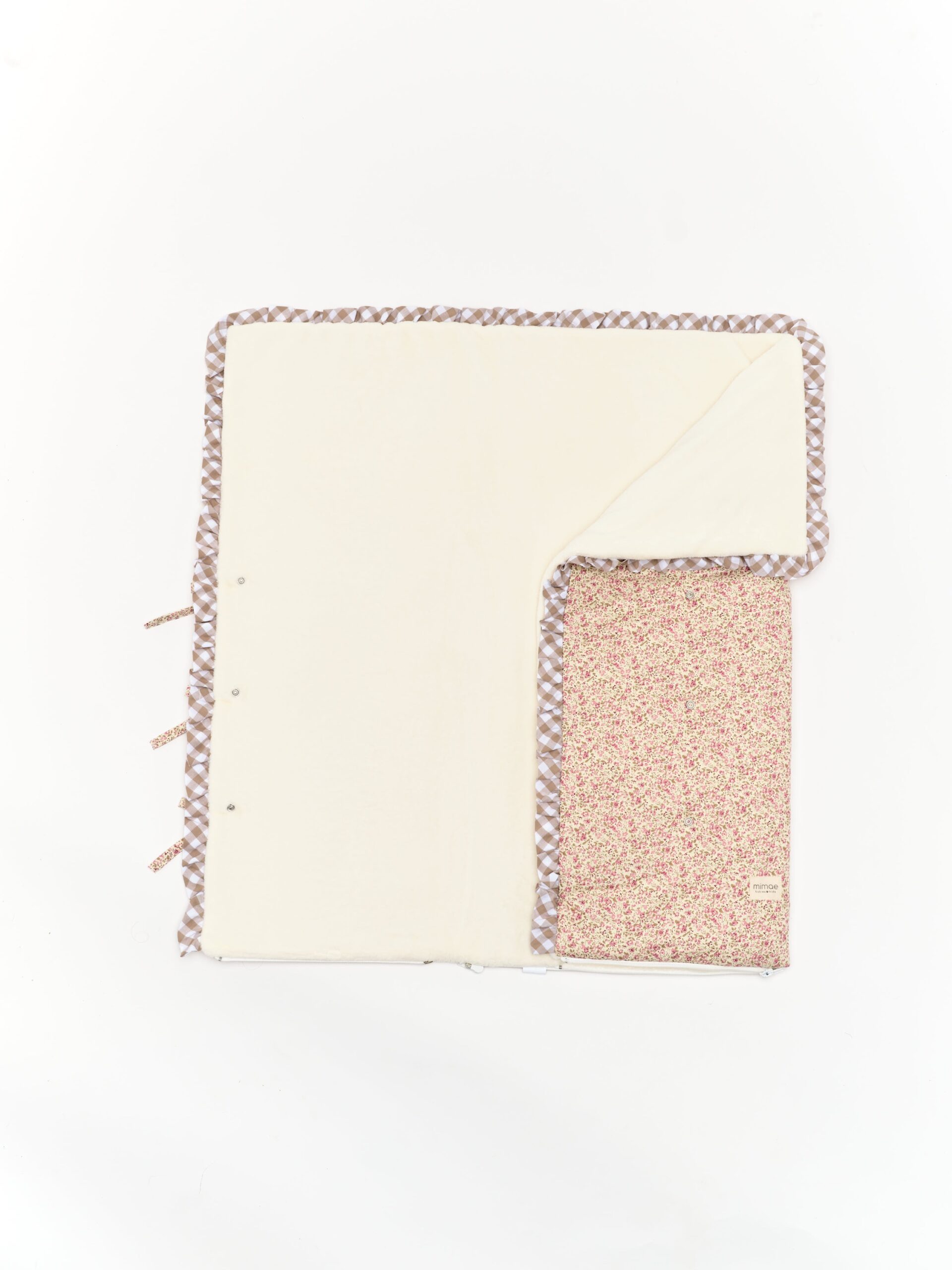 Saco capazo de pelito Nikole con volante vichy beige.  Ideal para los primeros paseos en el capazo y para  arropar a tu bebé en la cuna o cuando lo tengas en los brazos. Se puede utilizar como arrullo o también se puede utilizar como mantita. Recomendaciones de lavado: Se puede lavar a mano o a máquina. Para lavadora elegir programa delicado con agua fría máx 30º y centrifugado suave. No utilizar secadora.