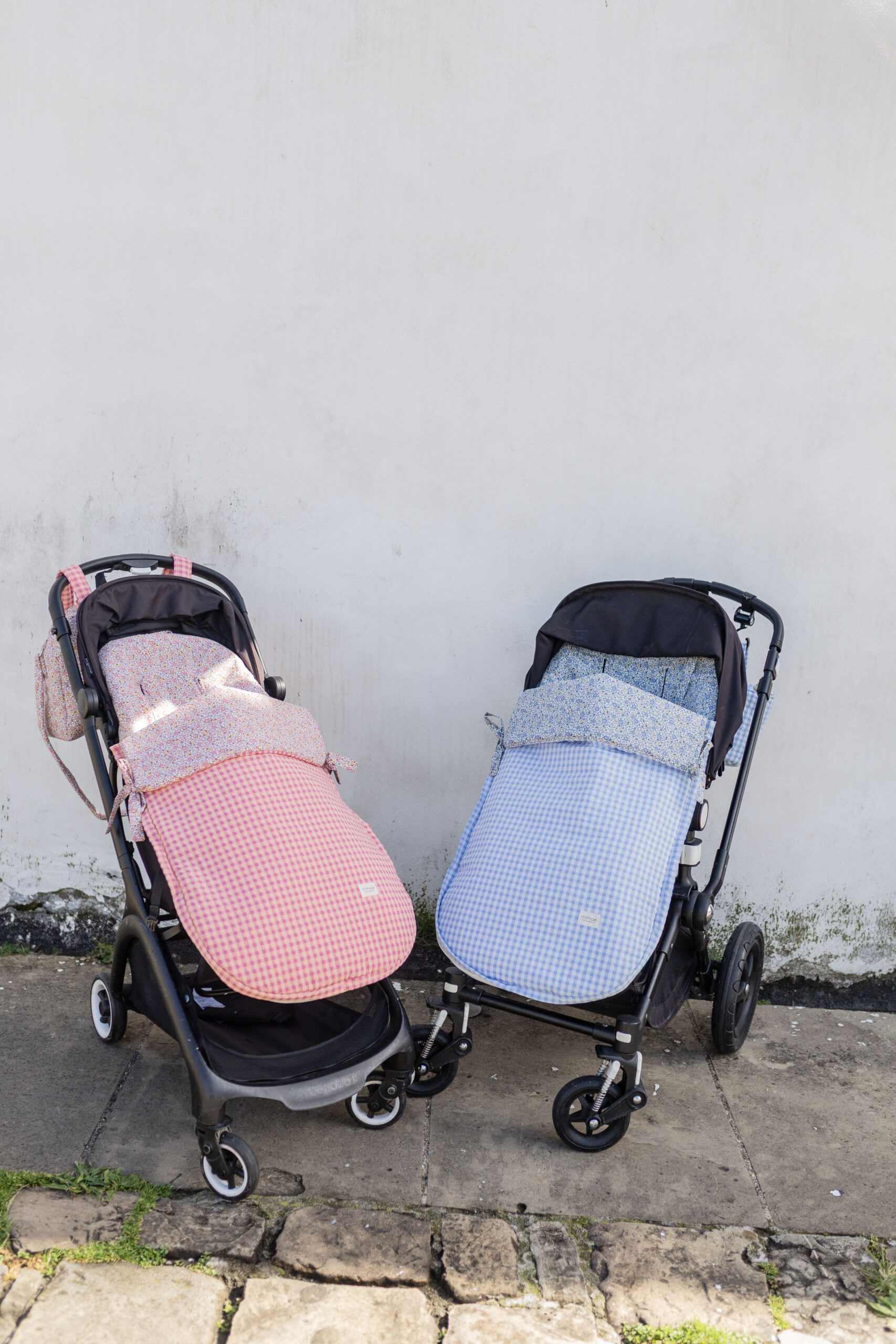 Saco universal para silla de paseo. Acolchado con una guata efecto pluma, el saco es totalmente extraíble mediante 2 cremalleras, para que pueda usarse como colchoneta los meses más cálidos. Parte trasera en Maya 3D, un tejido acolchado y transpirable. Agarre mediante gomas, vueltas y lazos. Confeccionado en estampado de flores y vichy.