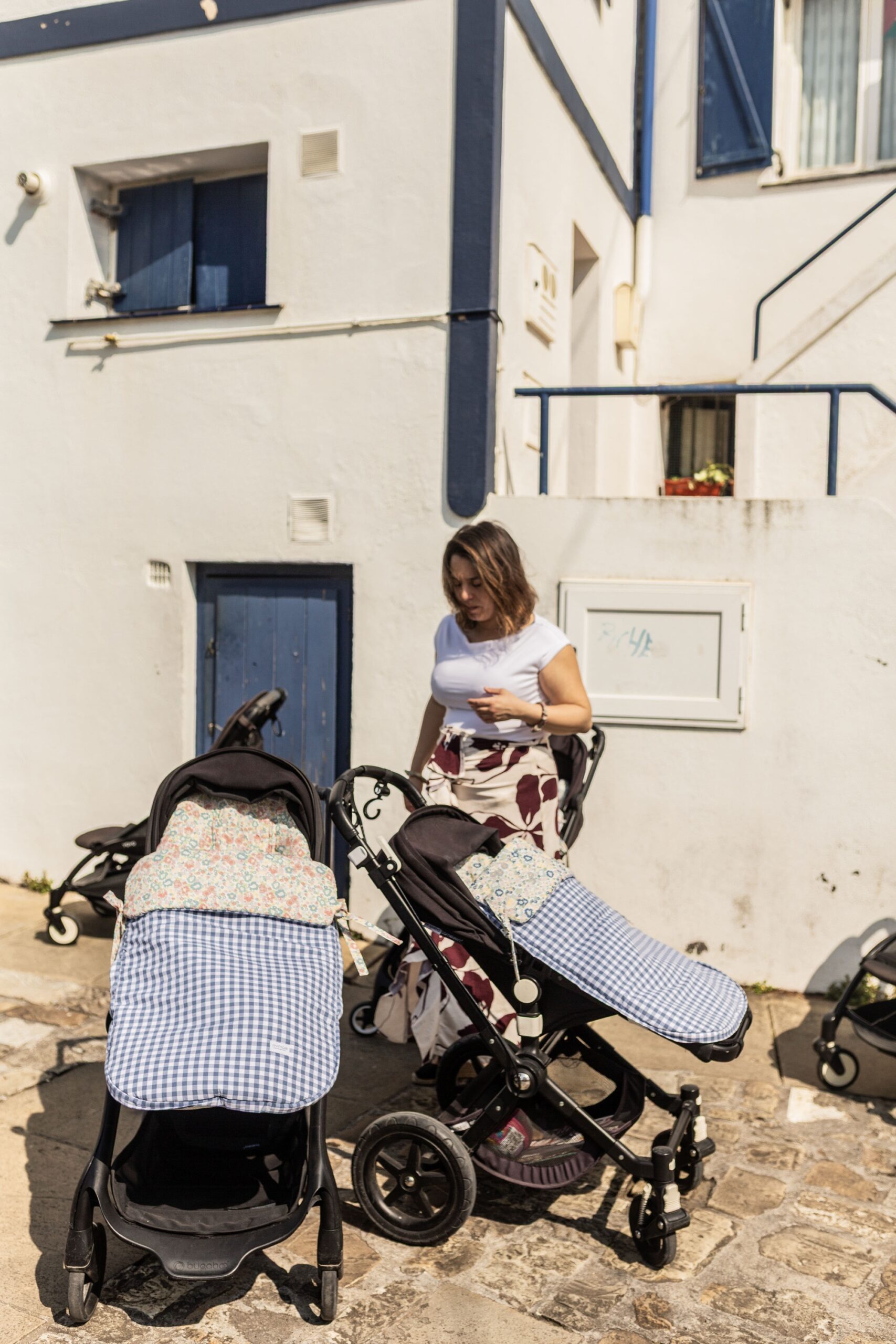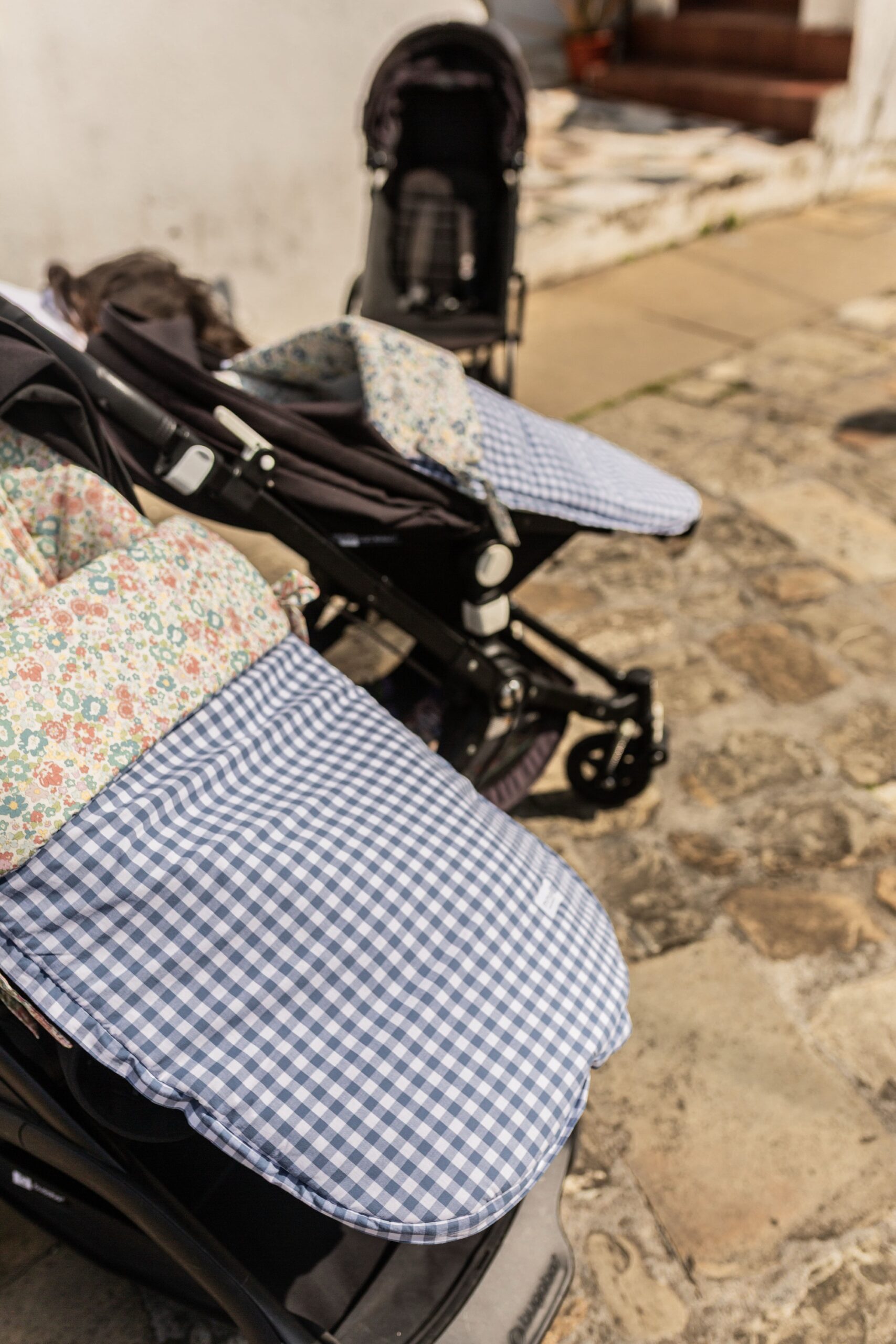 Saco universal para silla de paseo. Acolchado con una guata efecto pluma, el saco es totalmente extraíble mediante 2 cremalleras, para que pueda usarse como colchoneta los meses más cálidos. Parte trasera en Maya 3D, un tejido acolchado y transpirable. Agarre mediante gomas, vueltas y lazos. Confeccionado en estampado Alize y Vichy azul.