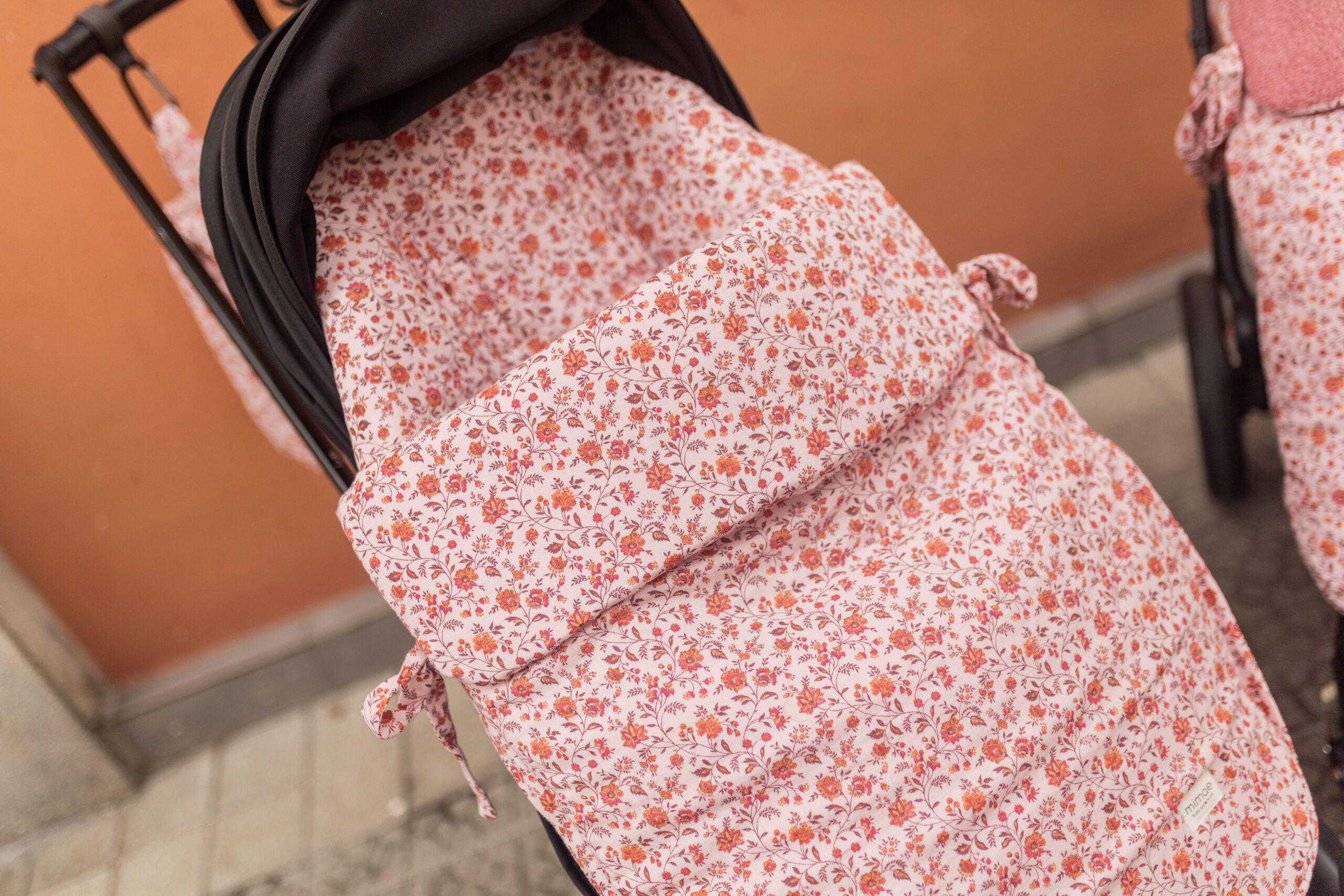 Saco universal para silla de paseo. Acolchado con una guata efecto pluma, el saco es totalmente extraíble mediante 2 cremalleras, para que pueda usarse como colchoneta los meses más cálidos. Parte trasera en Maya 3D, un tejido acolchado y transpirable. Agarre mediante gomas, vueltas y lazos. Confeccionado en tejido Flora.