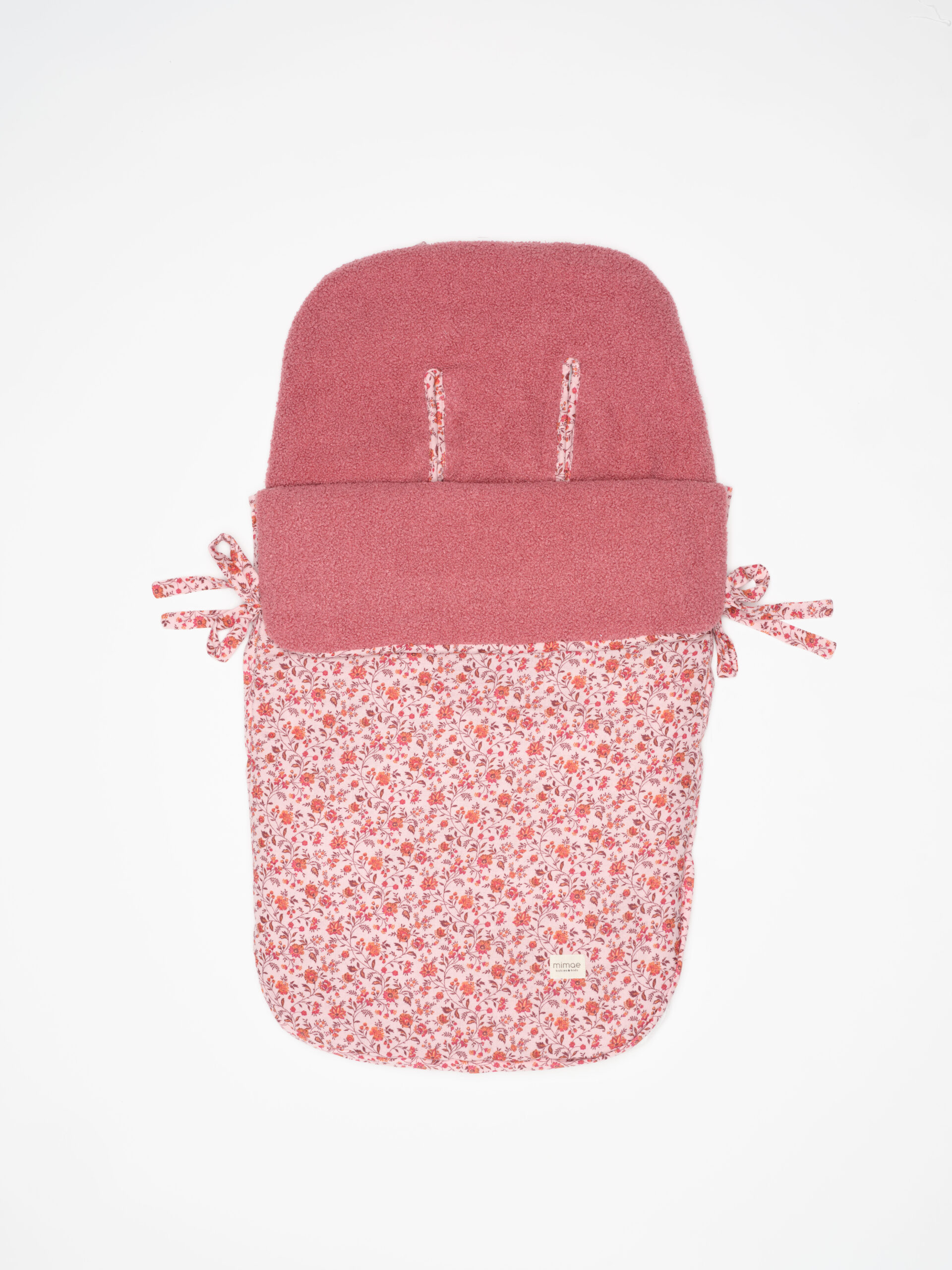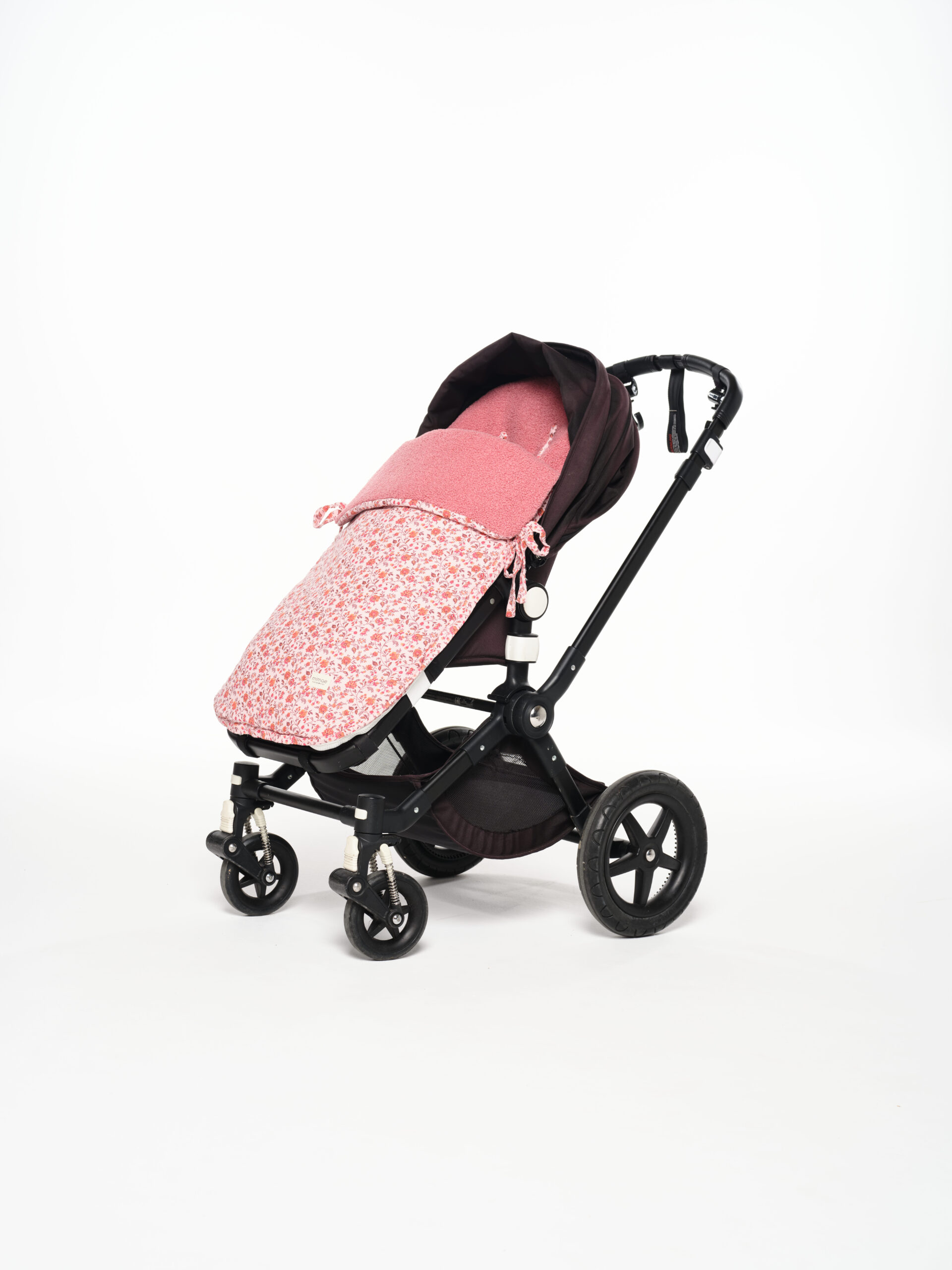 Saco universal para silla de paseo de invierno. Acolchado con una guata doble efecto pluma con un tejido de borrego super suave y abrigado, perfecto para los meses mas fríos. El saco es totalmente extraíble mediante 2 cremalleras, para que pueda usarse como colchoneta los meses más cálidos. Parte trasera en Maya 3D, un tejido acolchado y transpirable. Agarre mediante gomas, vueltas y lazos. Confeccionado en tejido Flora y borrego rosa.