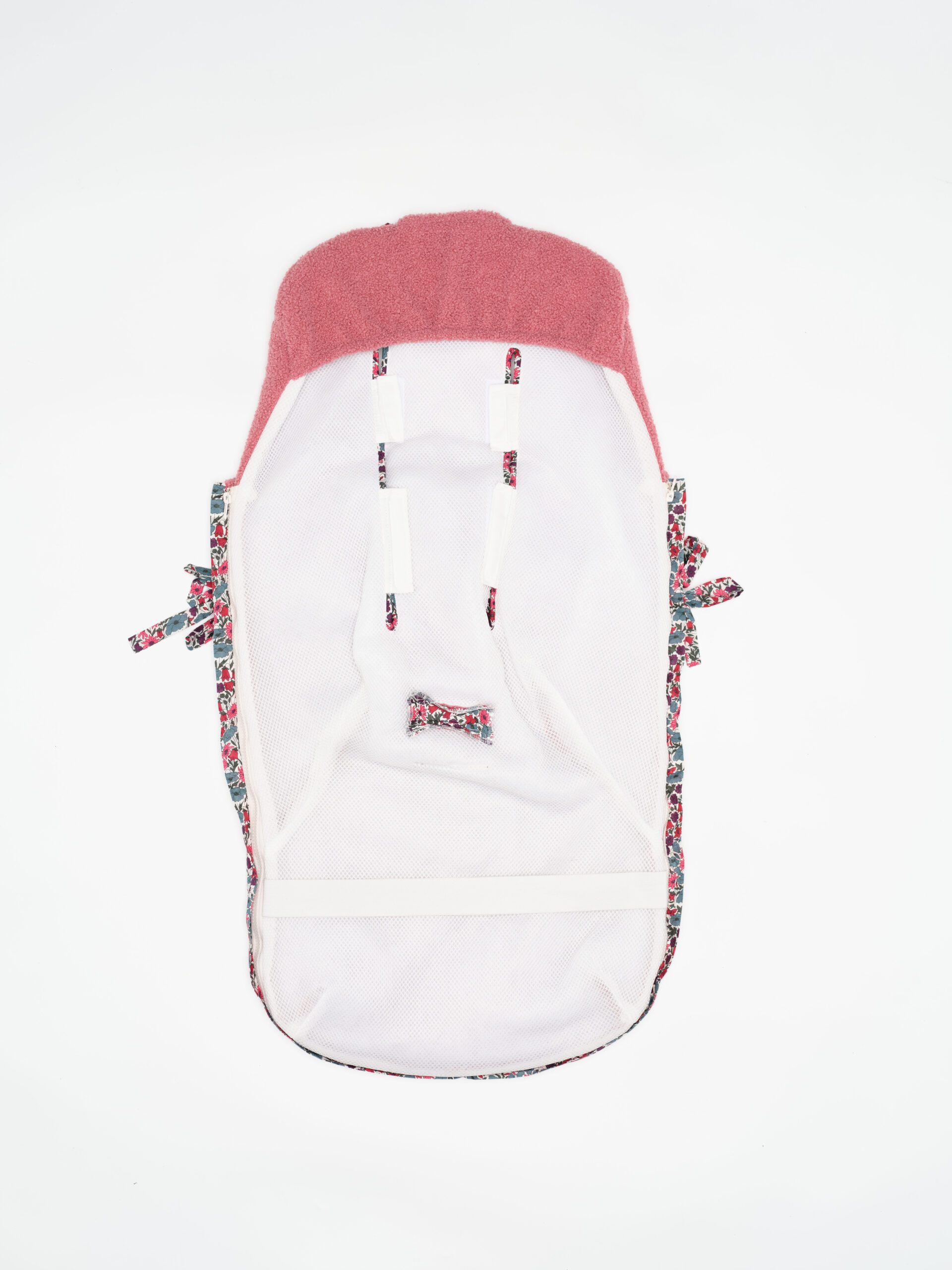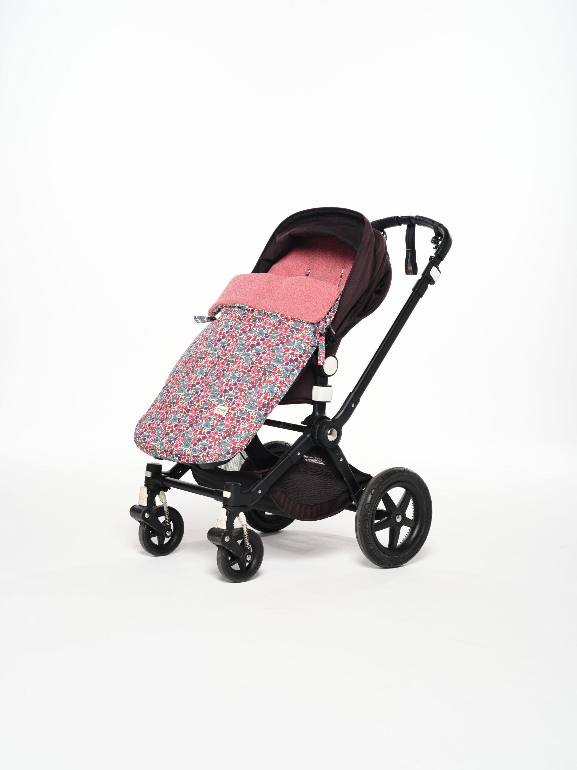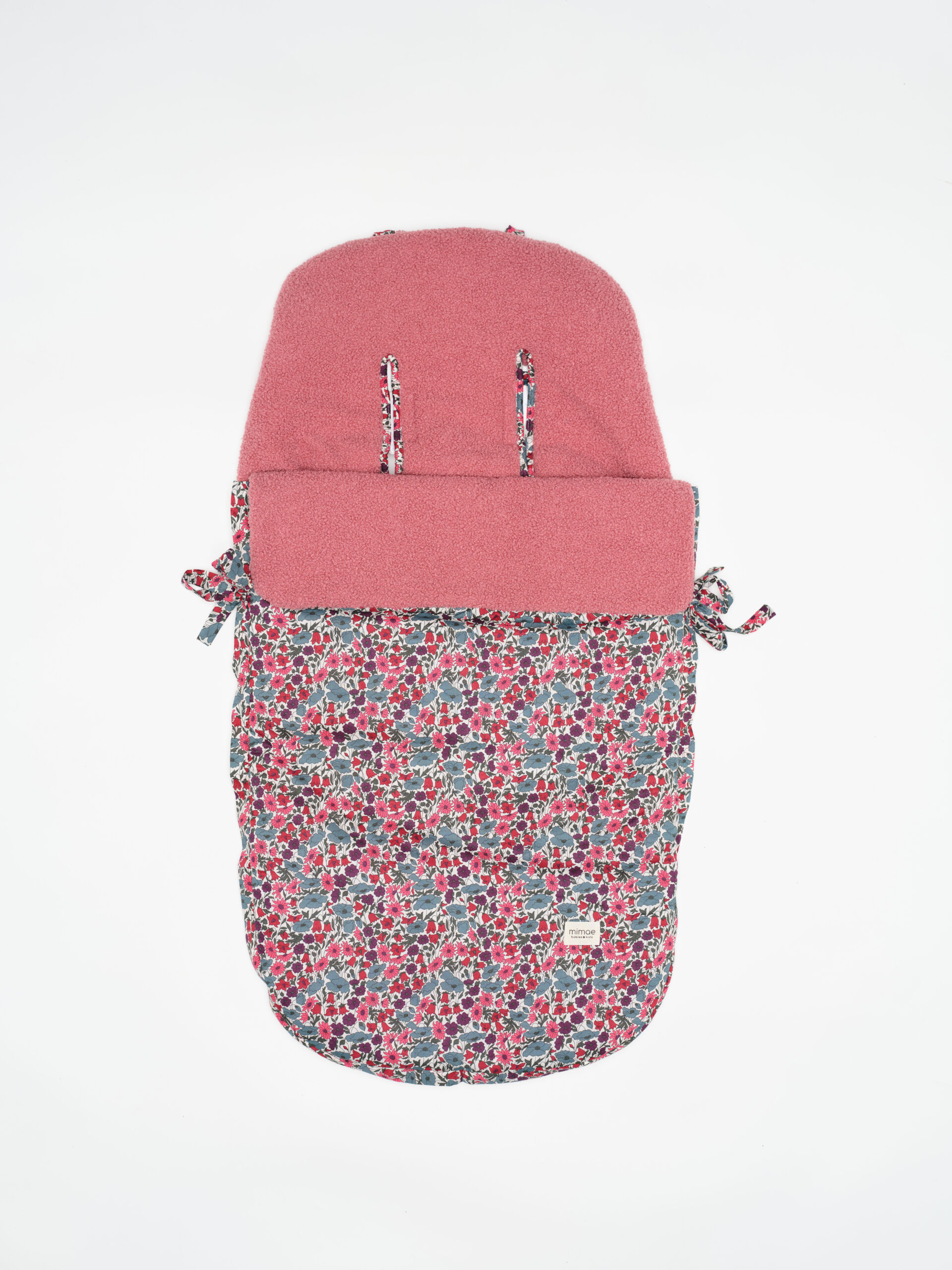 Saco universal para silla de paseo de invierno. Acolchado con una guata doble efecto pluma con un tejido de borrego super suave y abrigado, perfecto para los meses mas fríos. El saco es totalmente extraíble mediante 2 cremalleras, para que pueda usarse como colchoneta los meses más cálidos. Parte trasera en Maya 3D, un tejido acolchado y transpirable. Agarre mediante gomas, vueltas y lazos. Confeccionado en Liberty y Borrego Rosa