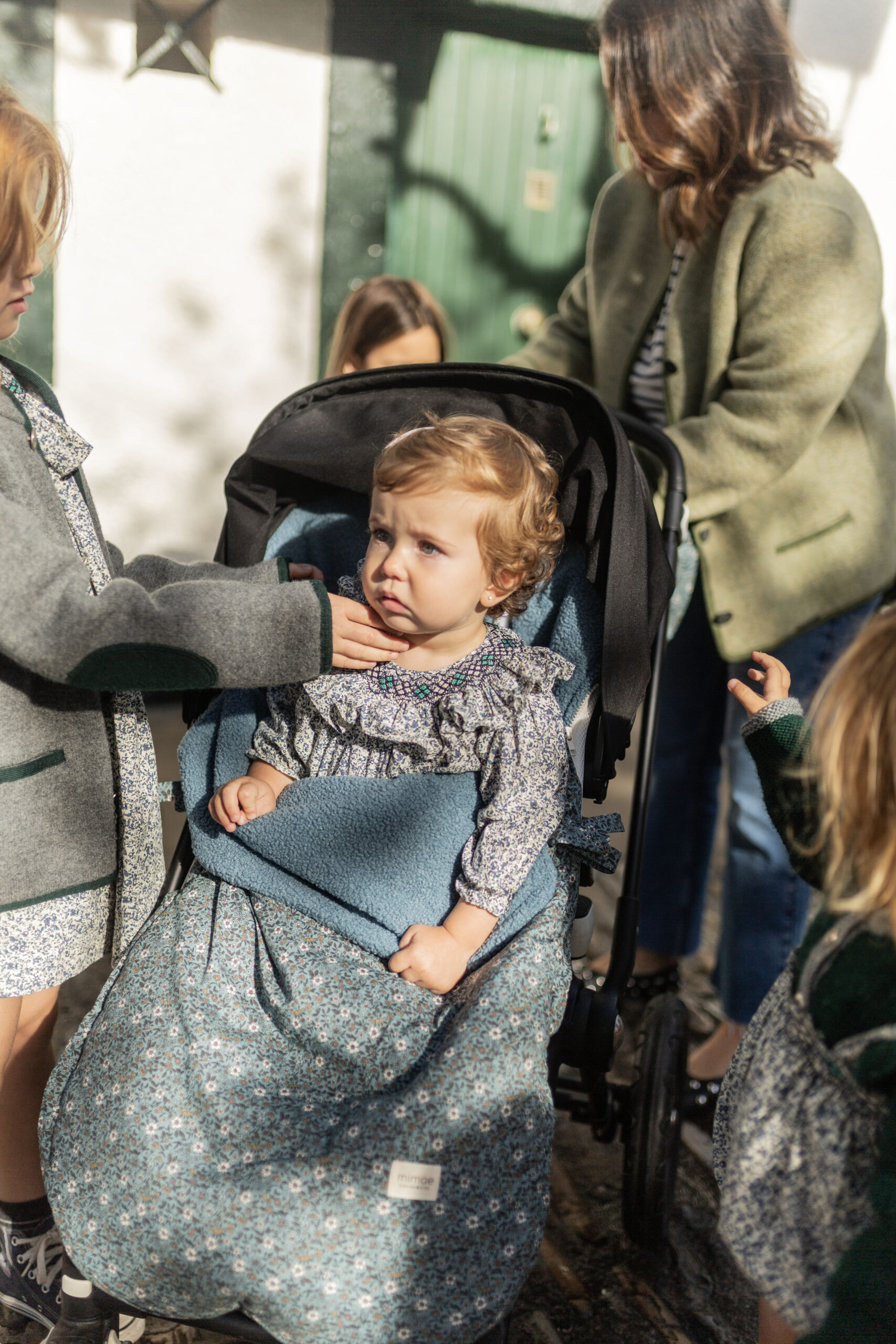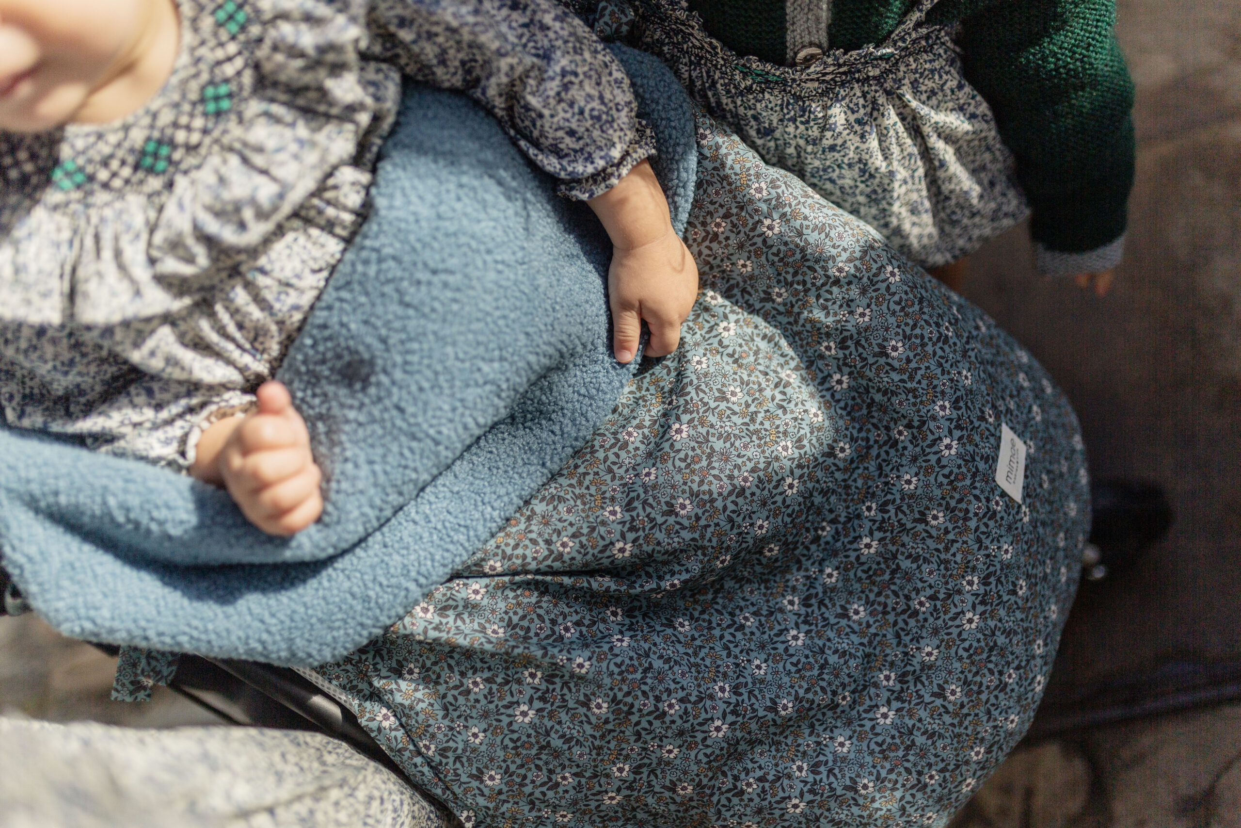 Saco universal para silla de paseo de invierno. Acolchado con una guata doble efecto pluma con un tejido de borrego super suave y abrigado, perfecto para los meses mas fríos. El saco es totalmente extraíble mediante 2 cremalleras. Parte trasera en Maya 3D, un tejido acolchado y transpirable. Agarre mediante gomas, vueltas y lazos. Confeccionado en Liberty Martin y borrego azul
