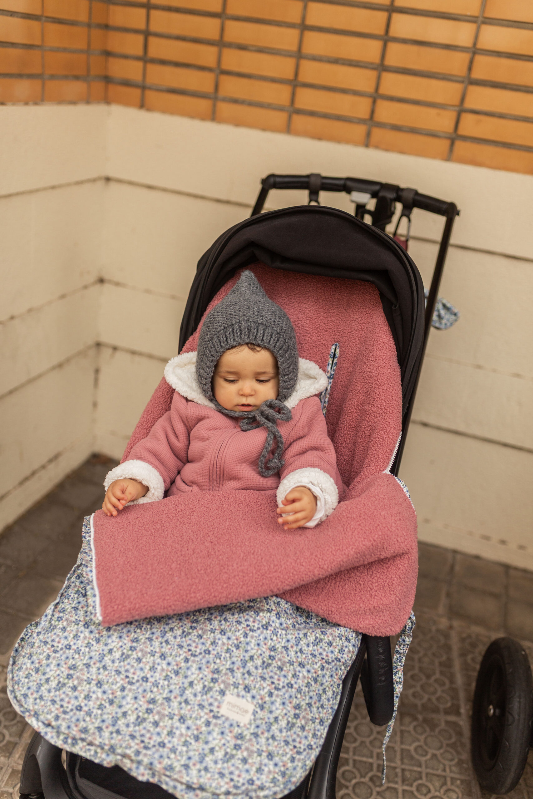 Saco universal para silla de paseo de invierno. Acolchado con una guata doble efecto pluma con un tejido de borrego super suave y abrigado, perfecto para los meses mas fríos. El saco es totalmente extraíble mediante 2 cremalleras, para que pueda usarse como colchoneta los meses más cálidos. Parte trasera en Maya 3D, un tejido acolchado y transpirable. Agarre mediante gomas, vueltas y lazos. Confeccionado en tejido Niko+borrego rosa.