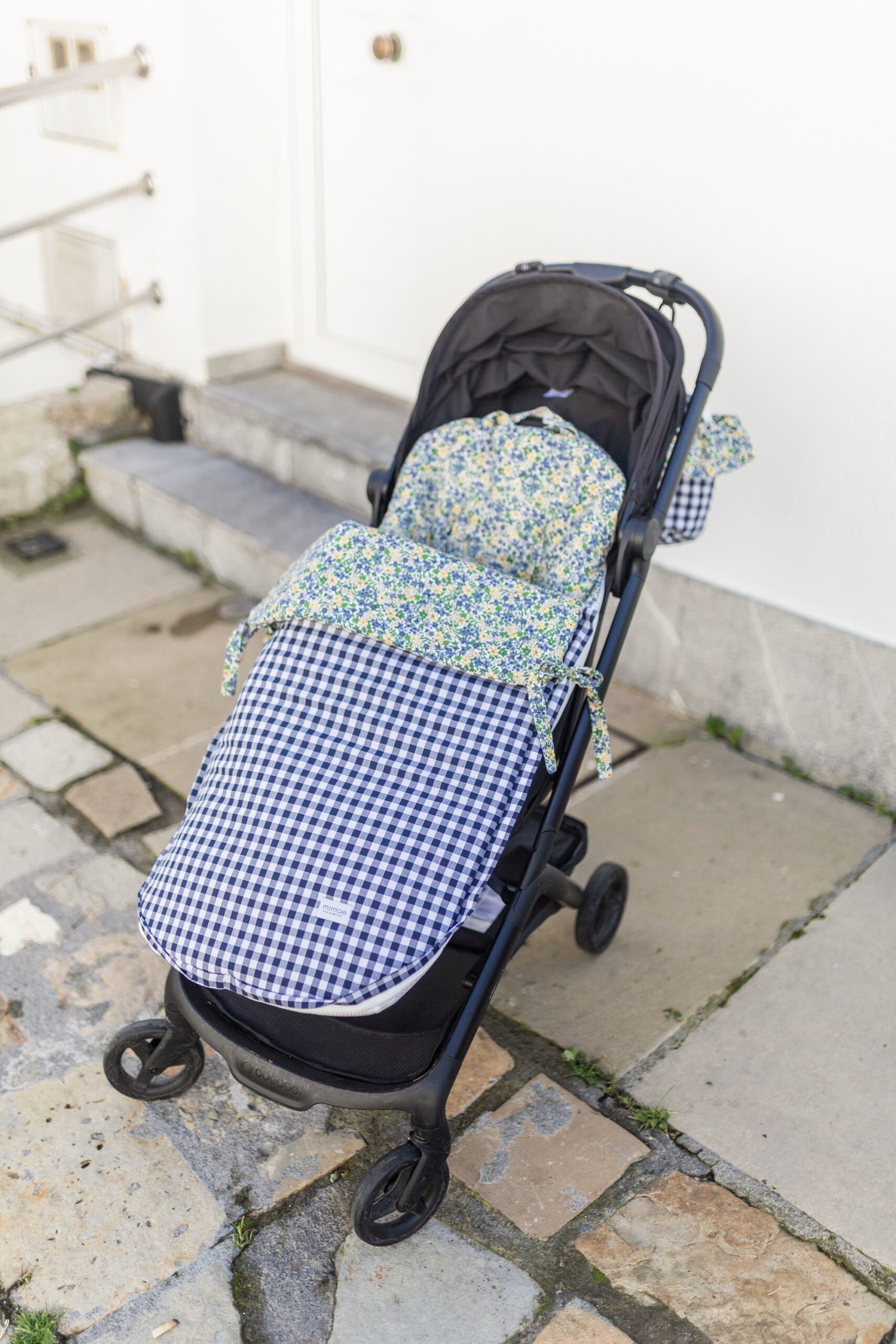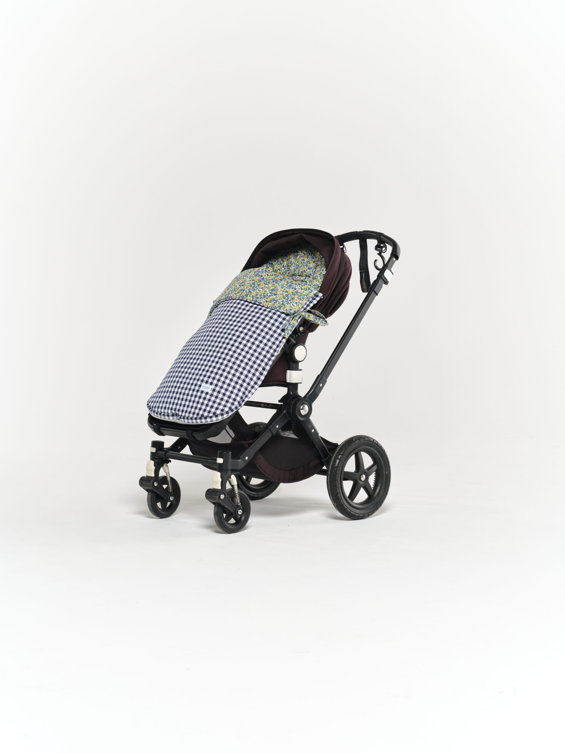 Saco universal para silla de paseo. Acolchado con una guata efecto pluma, el saco es totalmente extraíble mediante 2 cremalleras, para que pueda usarse como colchoneta los meses más cálidos. Parte trasera en Maya 3D, un tejido acolchado y transpirable. Agarre mediante gomas, vueltas y lazos. Confeccionado en estampado Leo y vichy navy.