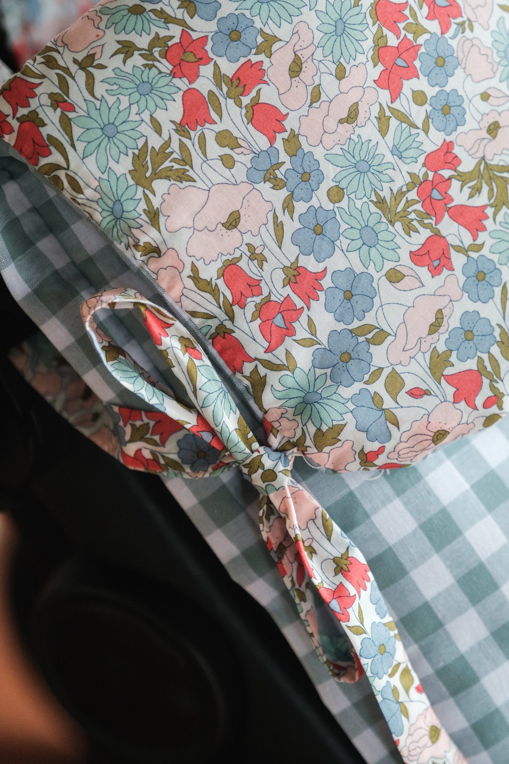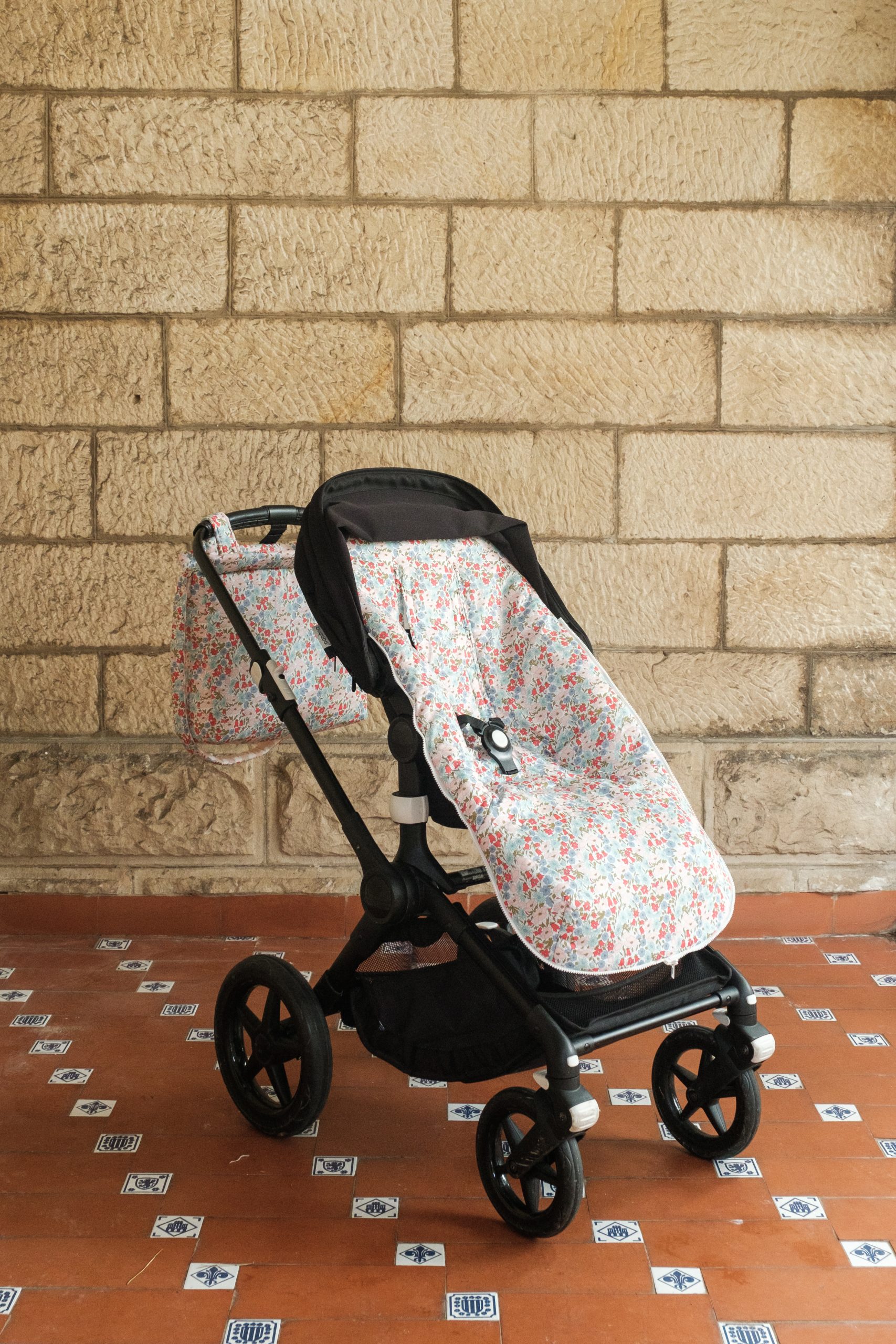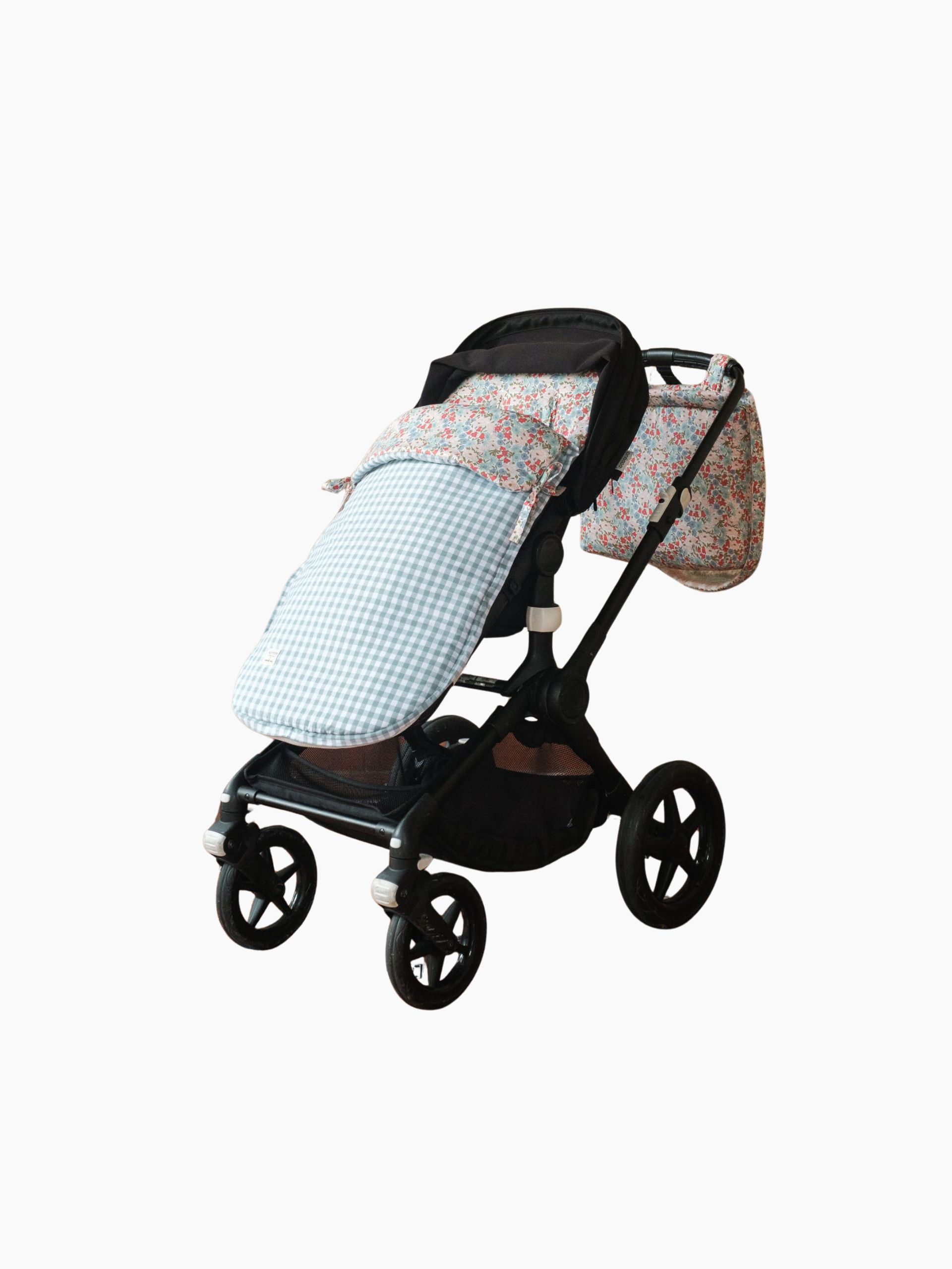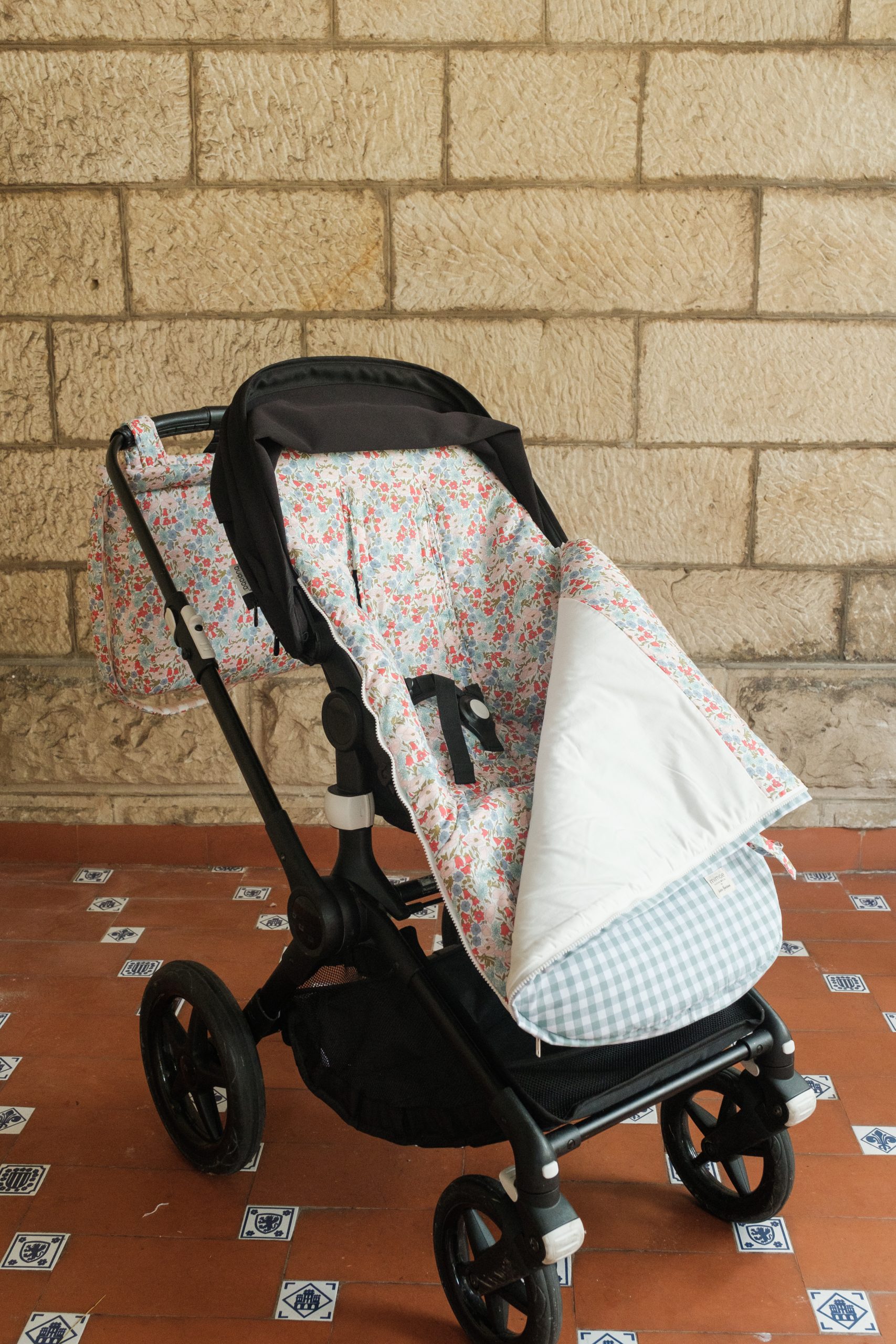 Saco universal para silla de paseo. Acolchado con una guata efecto pluma perfectos para entretiempo, el saco es totalmente extraible mediante 2 cremalleras, para que pueda usarse como colchoneta los meses más cálidos. Parte trasera en Maya 3D, un tejido acolchado y transpirable. Agarre mediante gomas, vueltas y lazos. Confeccionado combinando Vichy Menta y liberty Lucía. Confeccionado con tejido liberty London Original, diseño by Lucía Bárcena.
