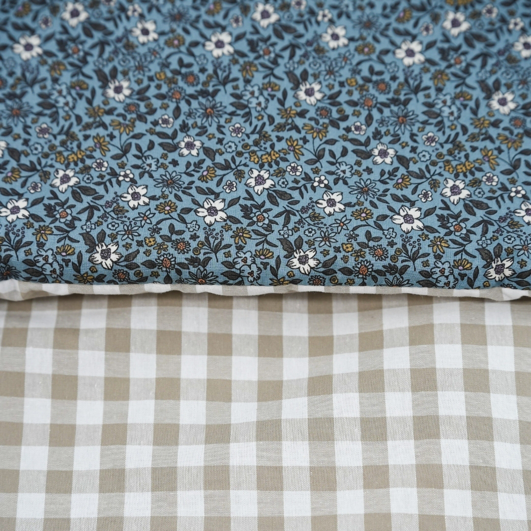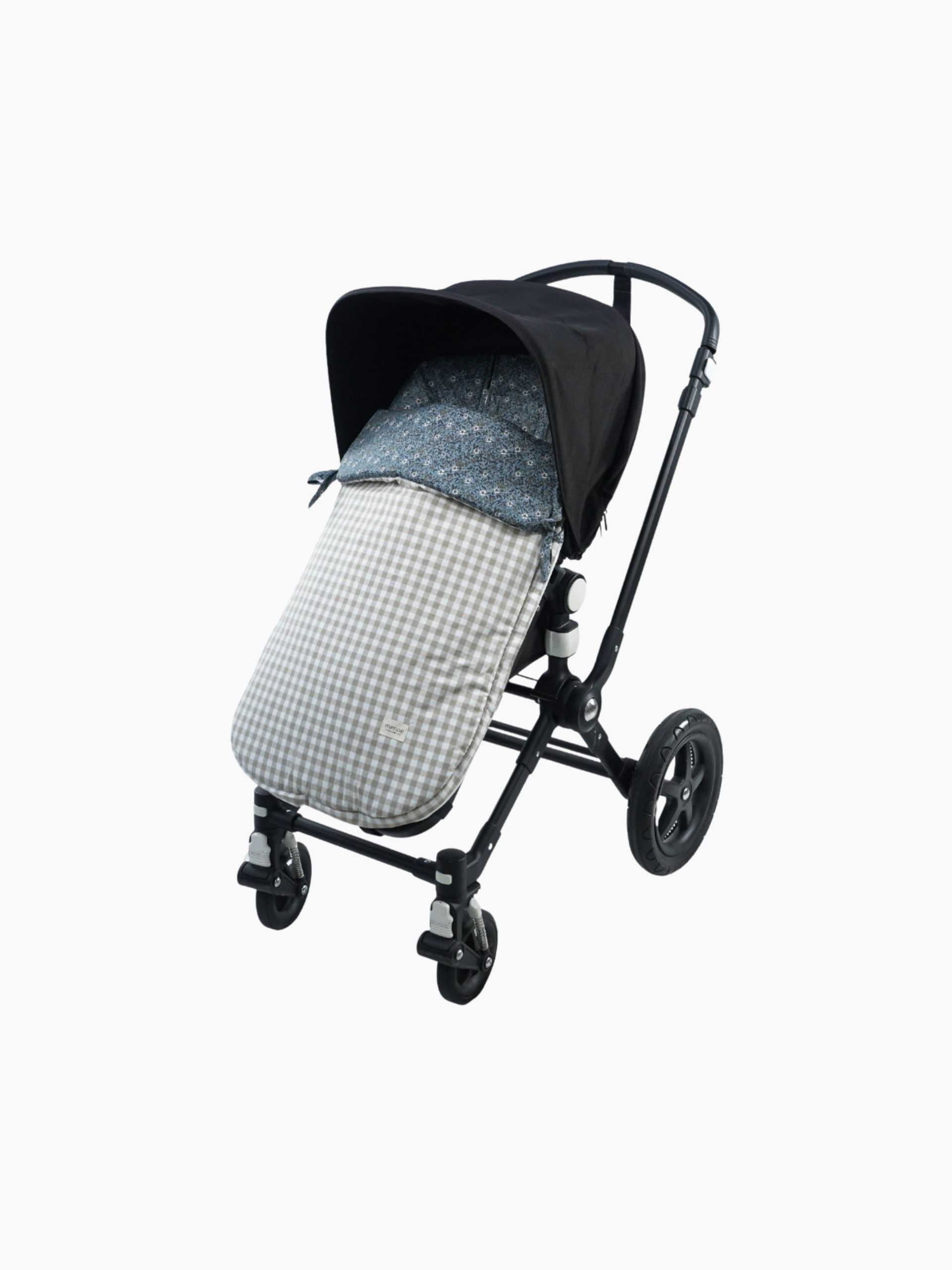 Saco universal para silla de paseo. Acolchado con una guata efecto pluma, el saco es totalmente extraíble mediante 2 cremalleras, para que pueda usarse como colchoneta los meses más cálidos. Parte trasera en Maya 3D, un tejido acolchado y transpirable. Agarre mediante gomas, vueltas y lazos. Confeccionado en Liberty Martin y vichy beige.