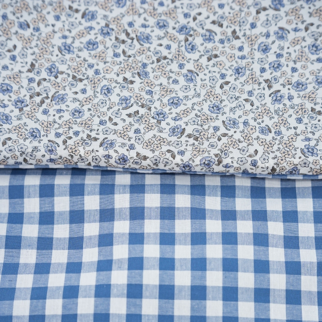 Saco universal para silla de paseo. Acolchado con una guata efecto pluma, el saco es totalmente extraíble mediante 2 cremalleras, para que pueda usarse como colchoneta los meses más cálidos. Parte trasera en Maya 3D, un tejido acolchado y transpirable. Agarre mediante gomas, vueltas y lazos. Confeccionado en Liberty Luken y vichy azul.