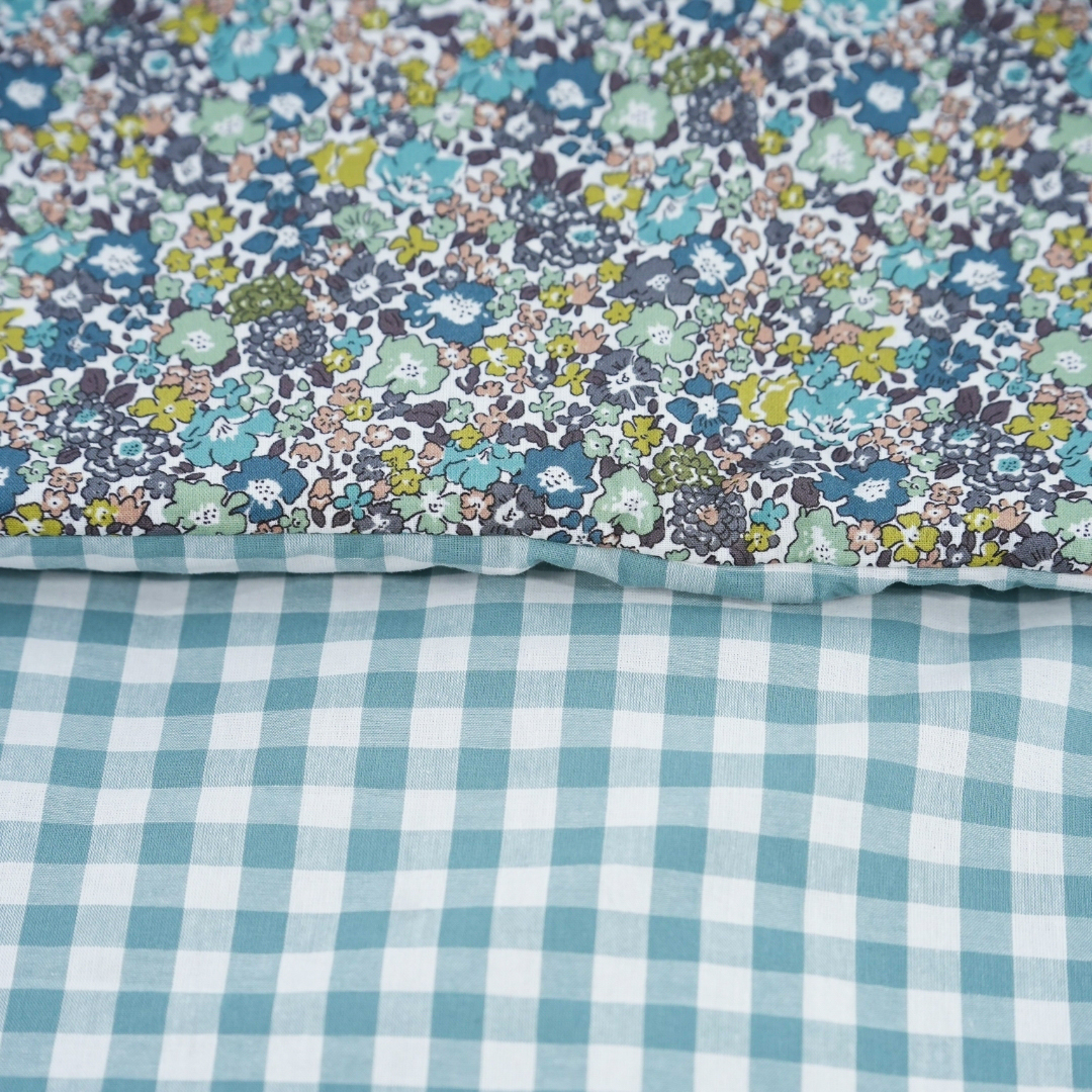 Saco universal para silla de paseo. Acolchado con una guata efecto pluma, el saco es totalmente extraíble mediante 2 cremalleras, para que pueda usarse como colchoneta los meses más cálidos. Parte trasera en Maya 3D, un tejido acolchado y transpirable. Agarre mediante gomas, vueltas y lazos. Confeccionado en Liberty Marina y Vichy Menta.