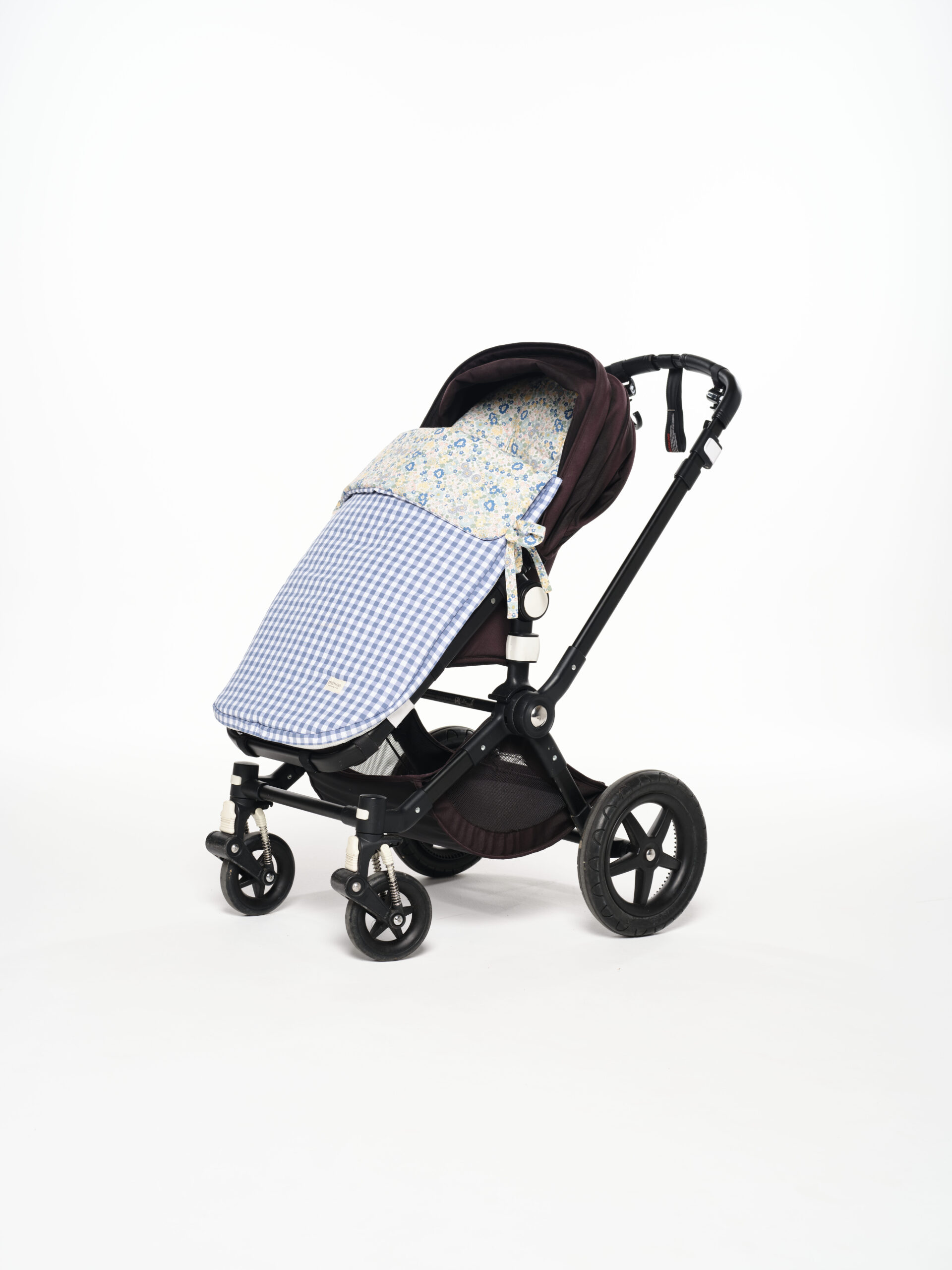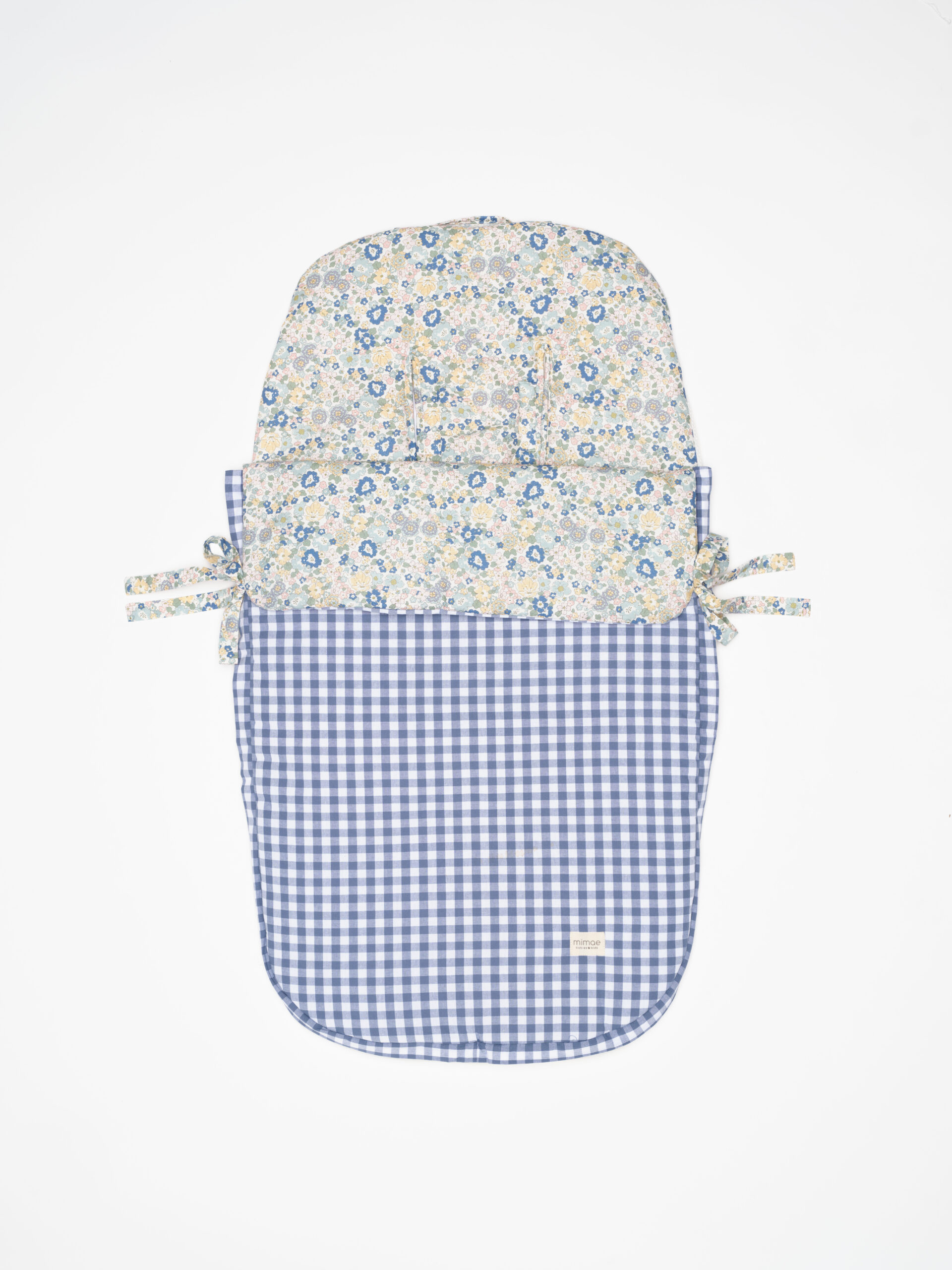 Saco universal para silla de paseo. Acolchado con una guata efecto pluma, el saco es totalmente extraíble mediante 2 cremalleras, para que pueda usarse como colchoneta los meses más cálidos. Parte trasera en Maya 3D, un tejido acolchado y transpirable. Agarre mediante gomas, vueltas y lazos. Confeccionado en estampado Mauri y vichy azul..