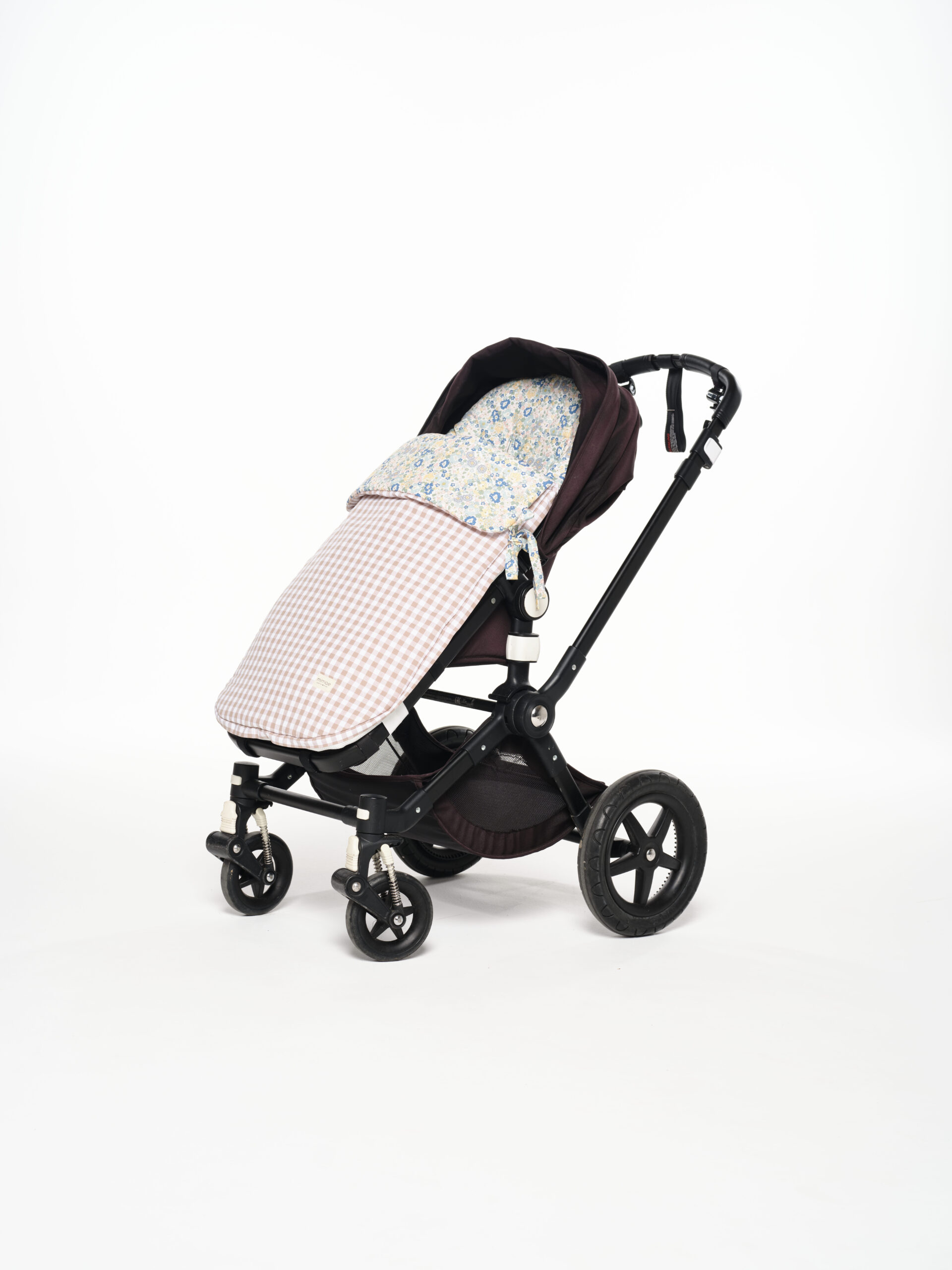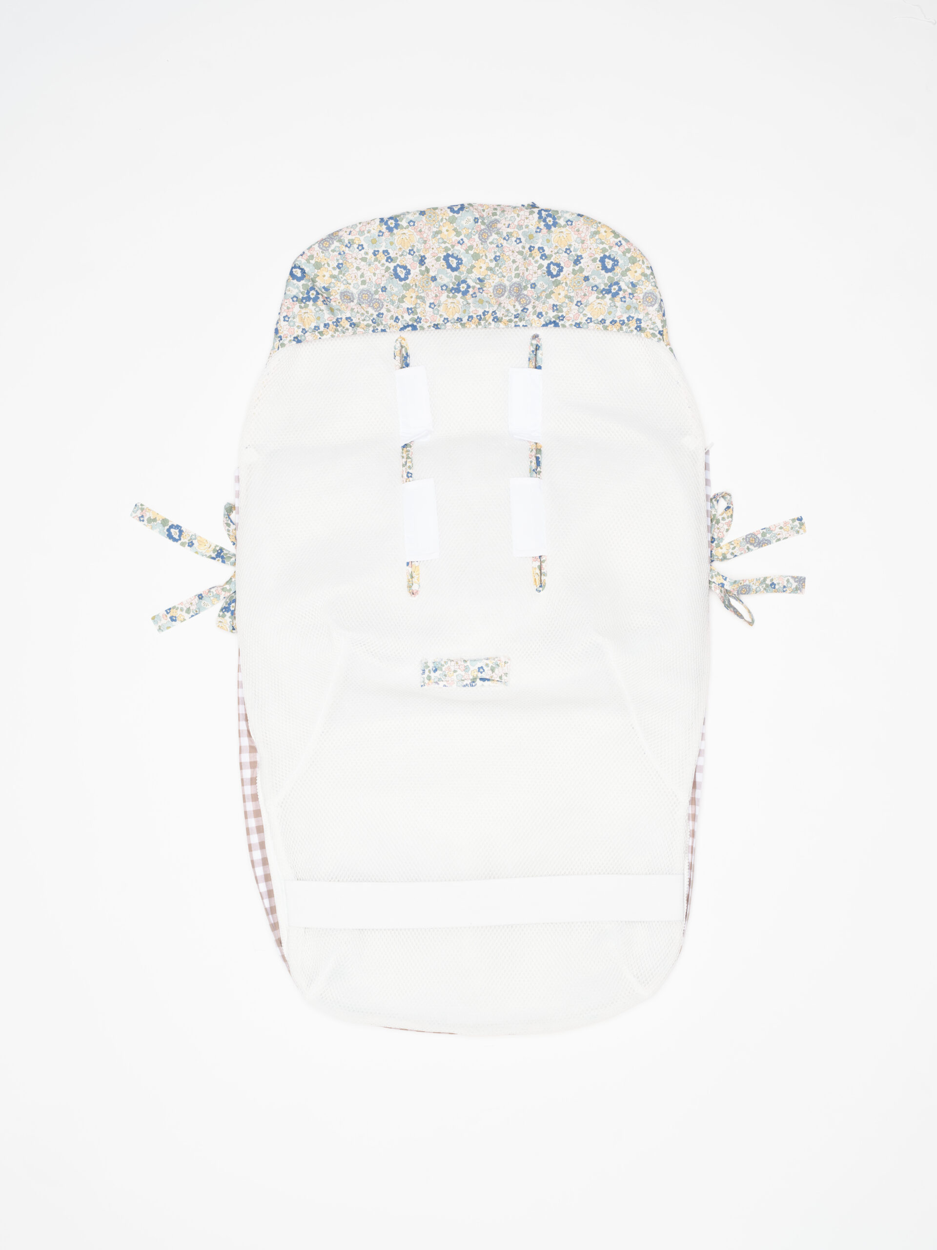 Saco universal para silla de paseo. Acolchado con una guata efecto pluma, el saco es totalmente extraíble mediante 2 cremalleras, para que pueda usarse como colchoneta los meses más cálidos. Parte trasera en Maya 3D, un tejido acolchado y transpirable. Agarre mediante gomas, vueltas y lazos. Confeccionado en estampado Mauri y vichy beige.