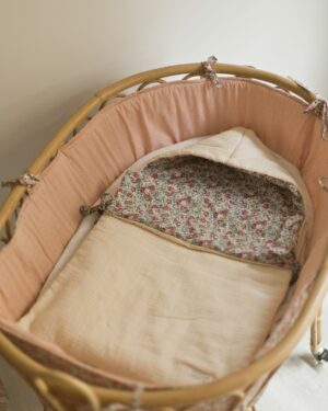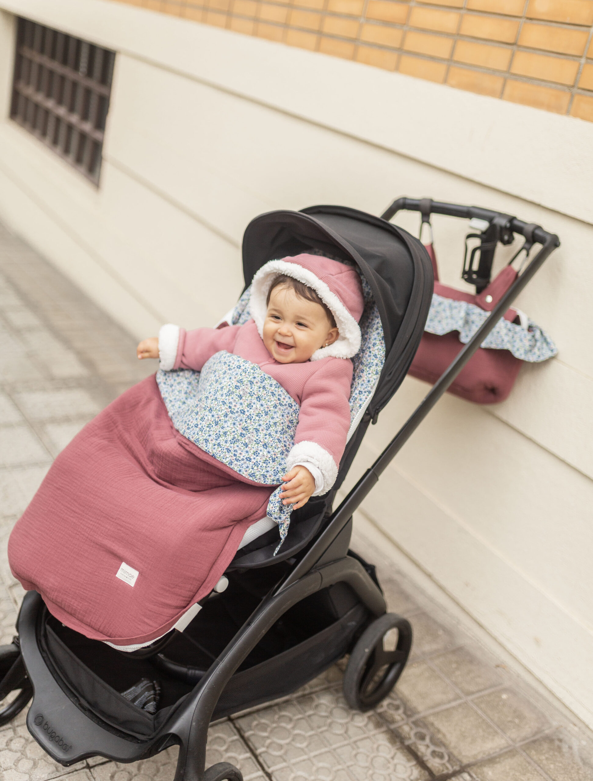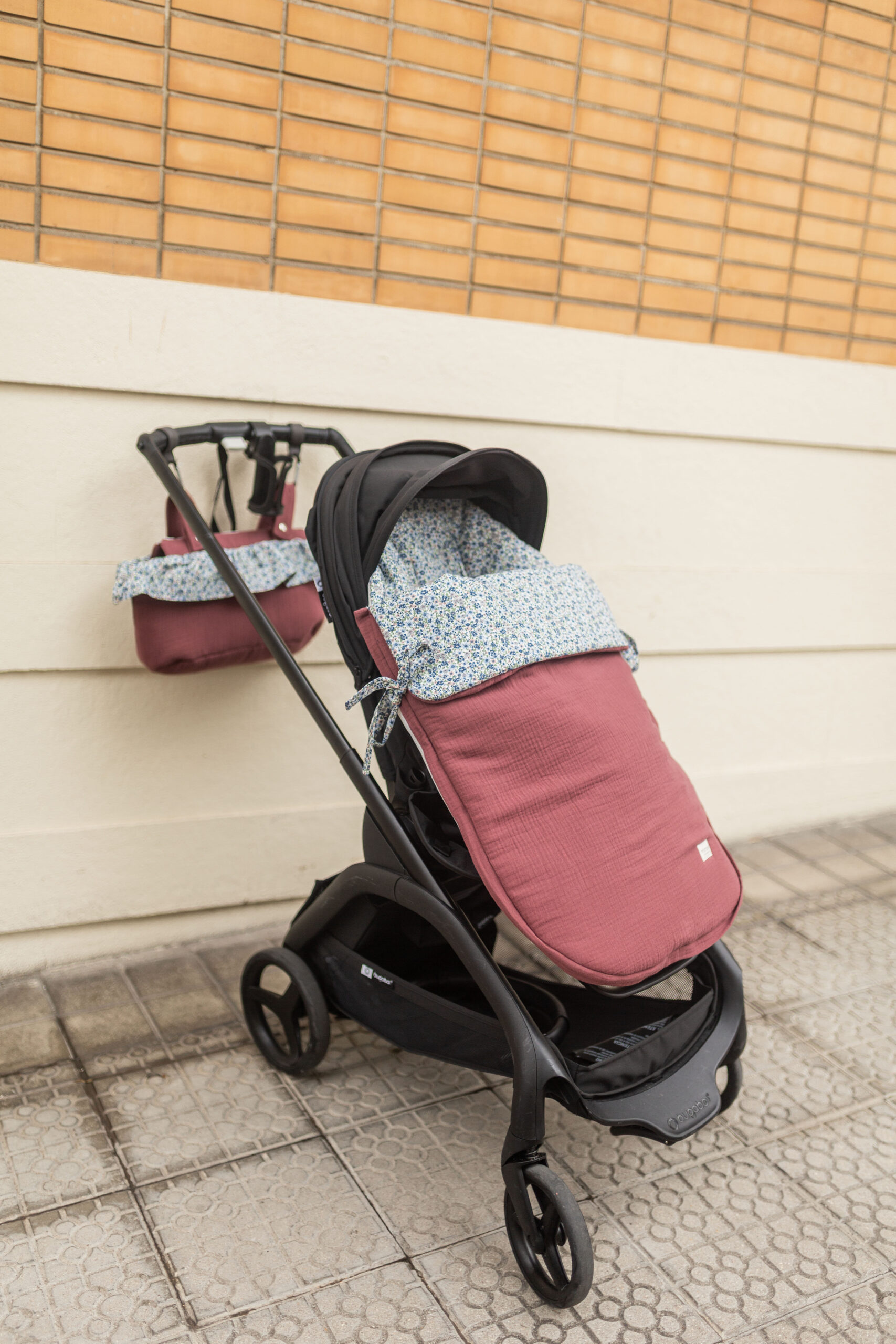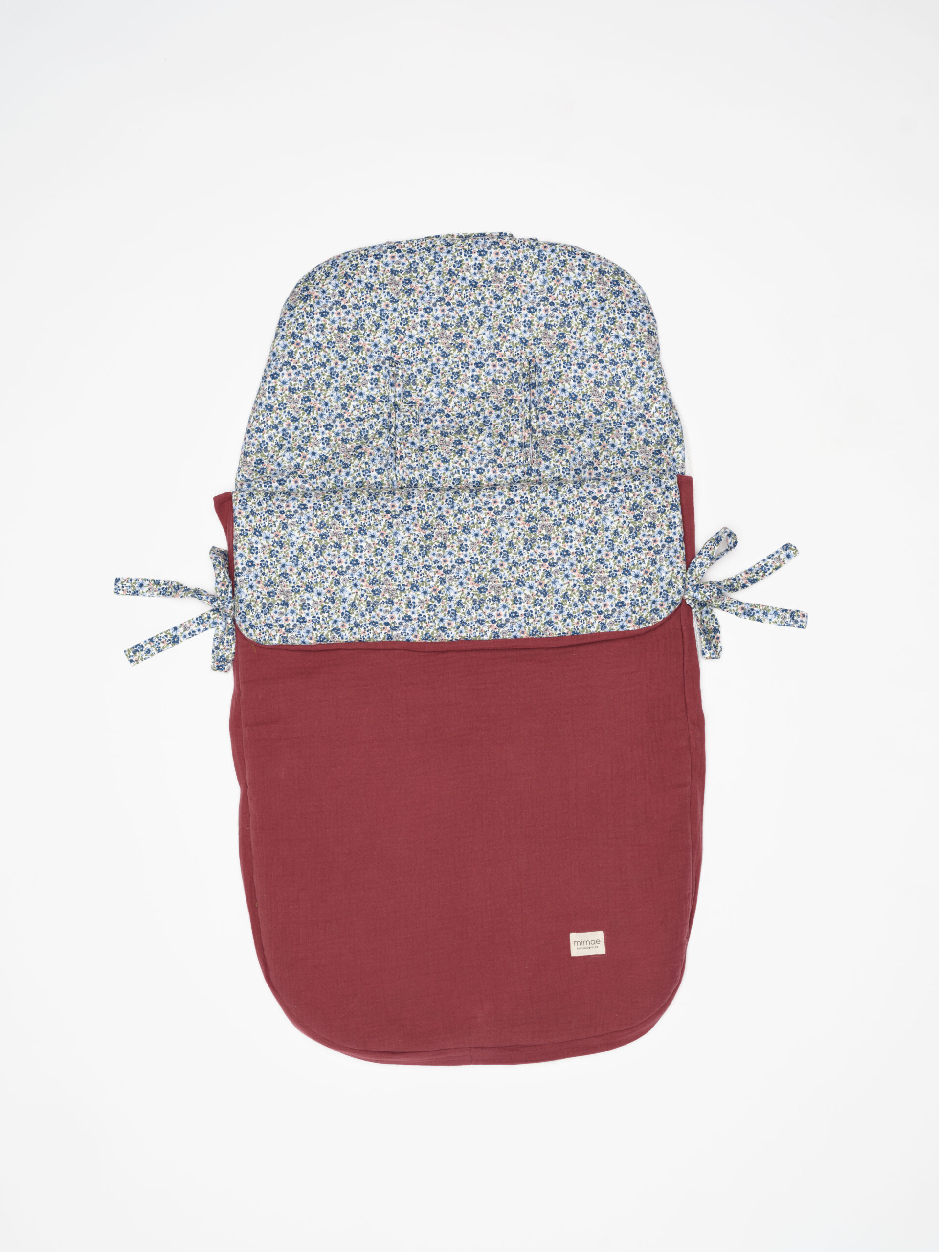 Saco universal para silla de paseo. Acolchado con una guata efecto pluma, el saco es totalmente extraíble mediante 2 cremalleras, para que pueda usarse como colchoneta los meses más cálidos. Parte trasera en Maya 3D, un tejido acolchado y transpirable. Agarre mediante gomas, vueltas y lazos. Confeccionado en estampado Niko y bambula granate.