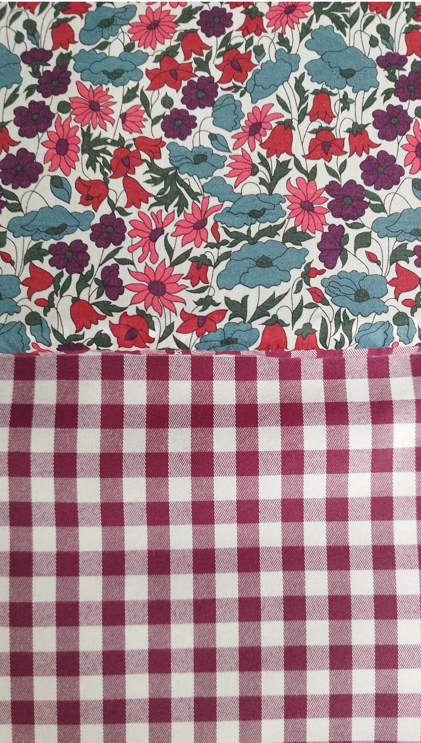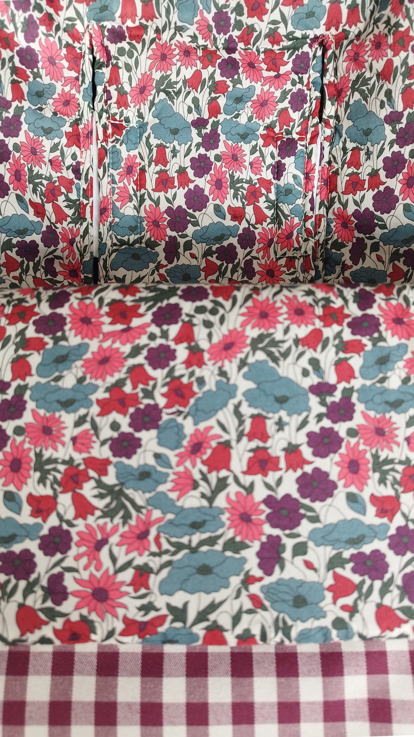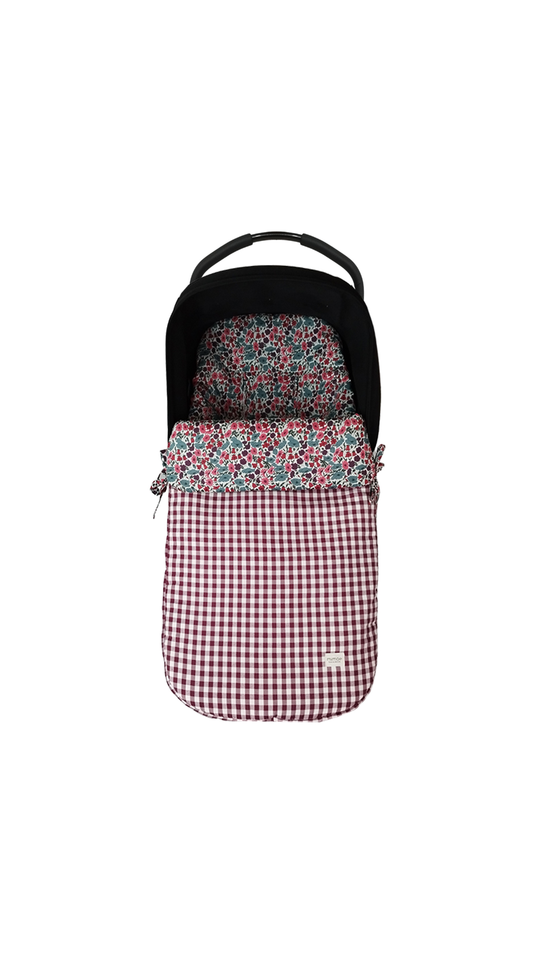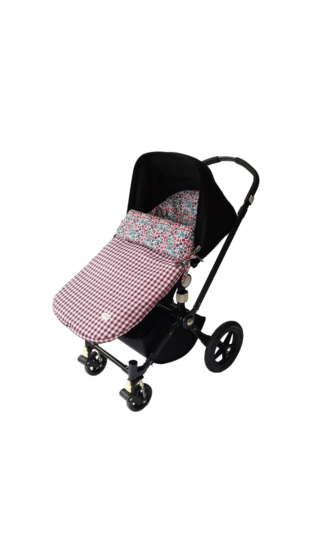 Saco universal para silla de paseo. Acolchado con una guata efecto pluma, el saco es totalmente extraíble mediante 2 cremalleras, para que pueda usarse como colchoneta los meses más cálidos. Parte trasera en Maya 3D, un tejido acolchado y transpirable. Agarre mediante gomas, vueltas y lazos. Confeccionado en Vichy Granate  y Liberty Bera