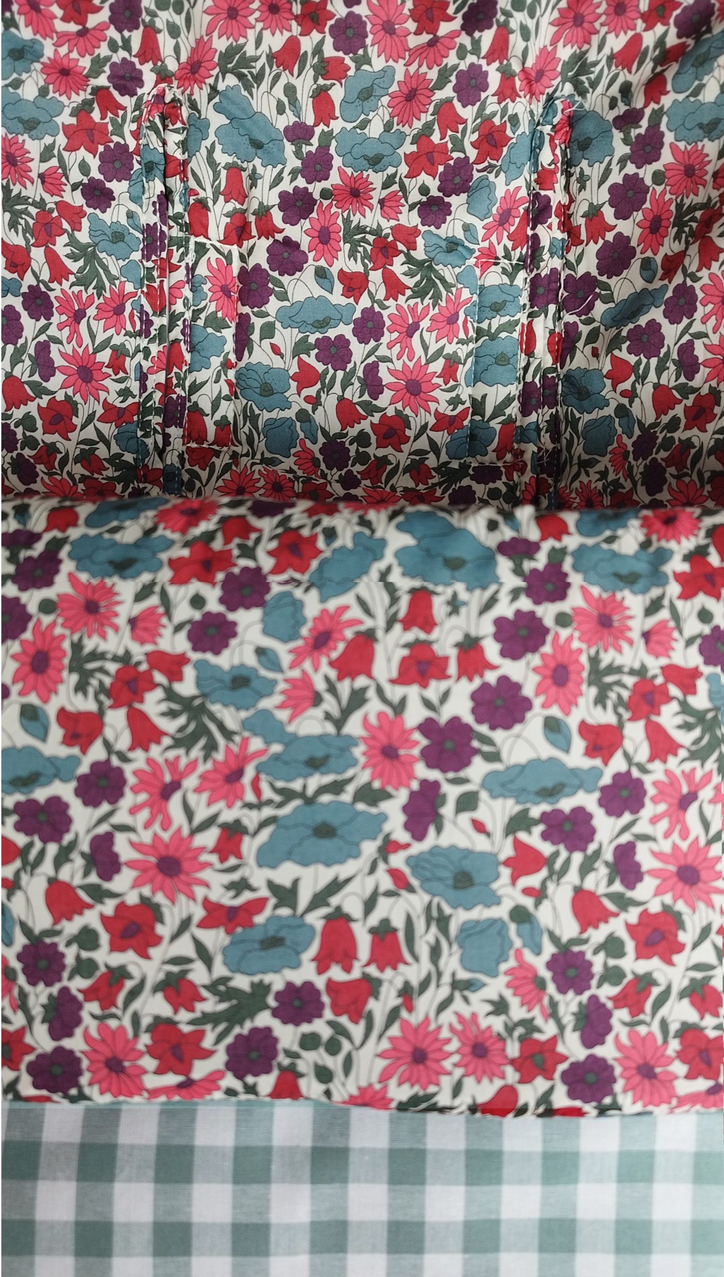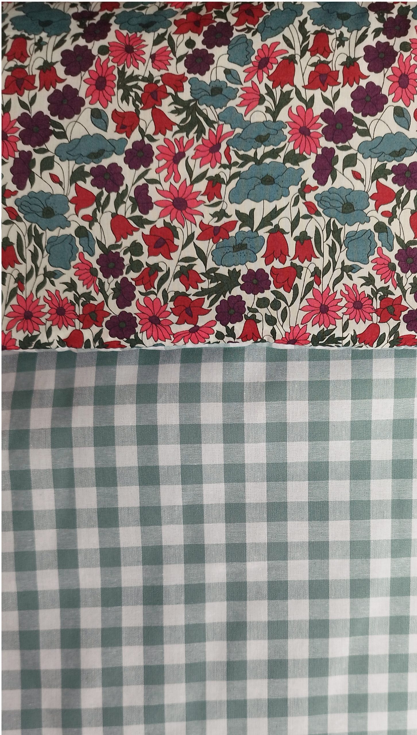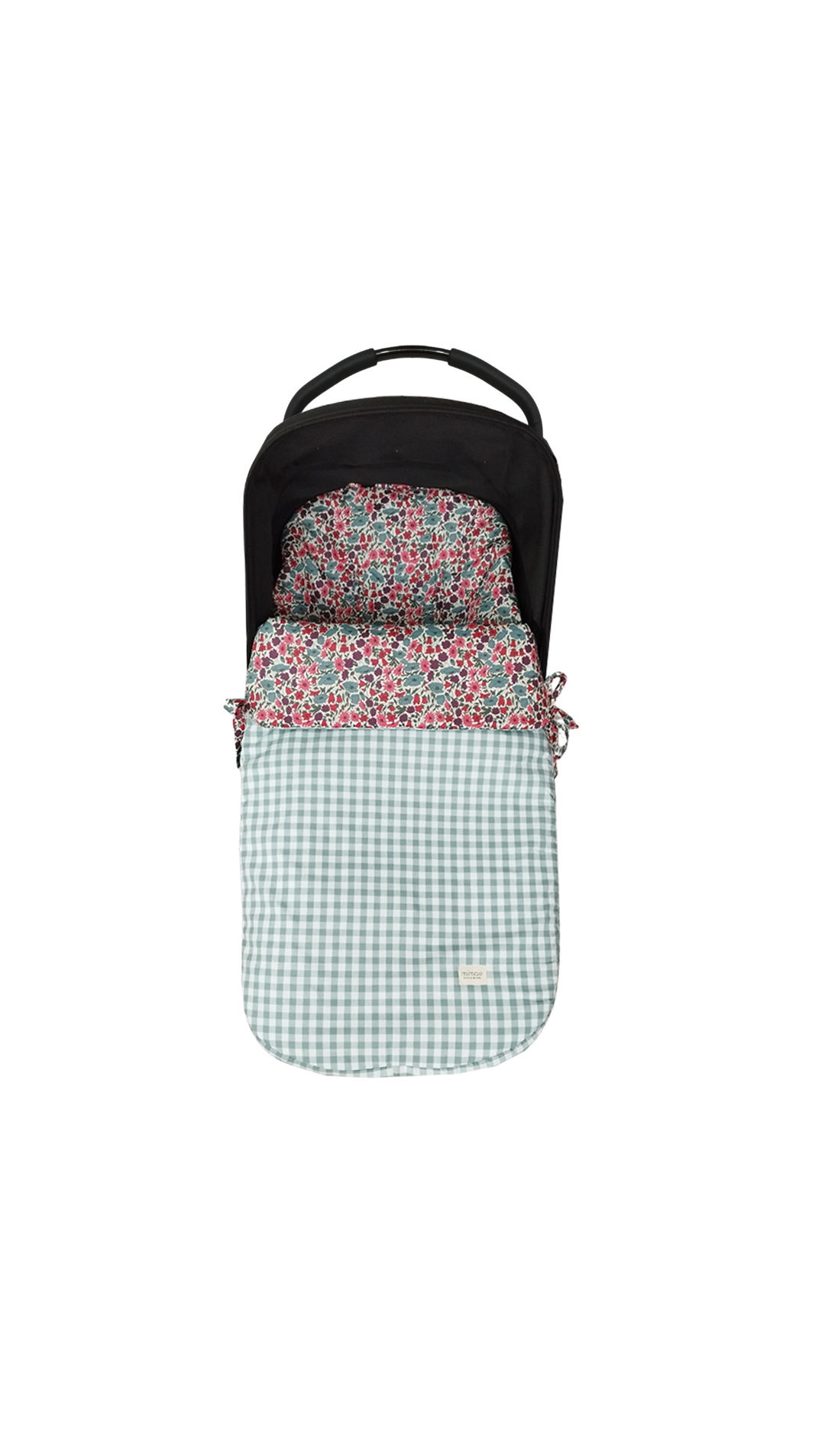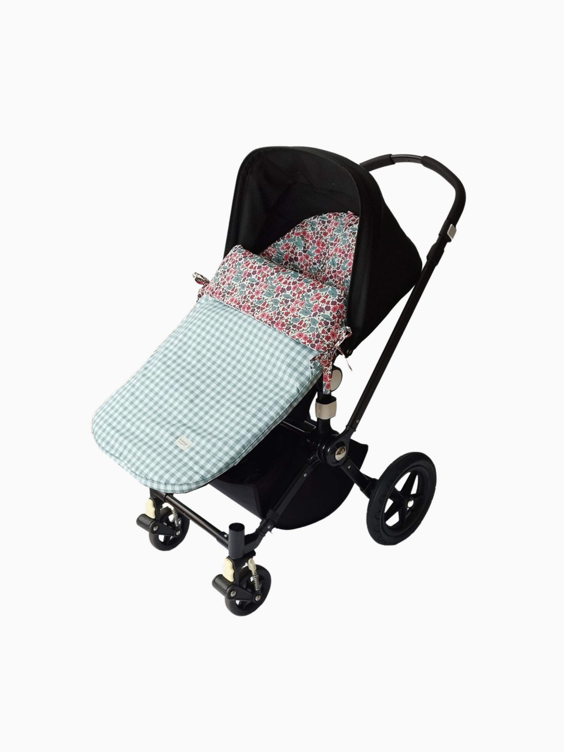 Saco universal para silla de paseo. Acolchado con una guata efecto pluma, el saco es totalmente extraible mediante 2 cremalleras, para que pueda usarse como colchoneta los meses más cálidos. Parte trasera en Maya 3D, un tejido acolchado y transpirable. Agarre mediante gomas, vueltas y lazos. Confeccionado en Vichy Menta  y Liberty Bera