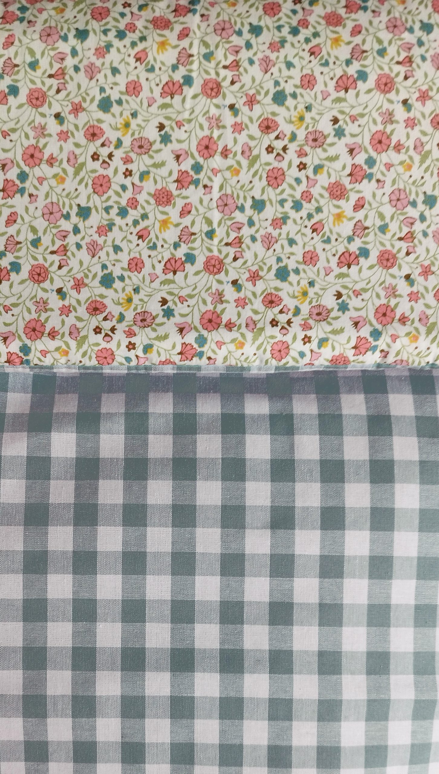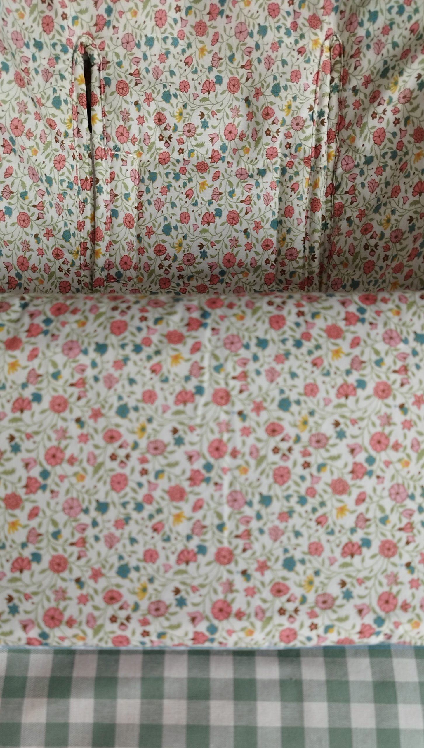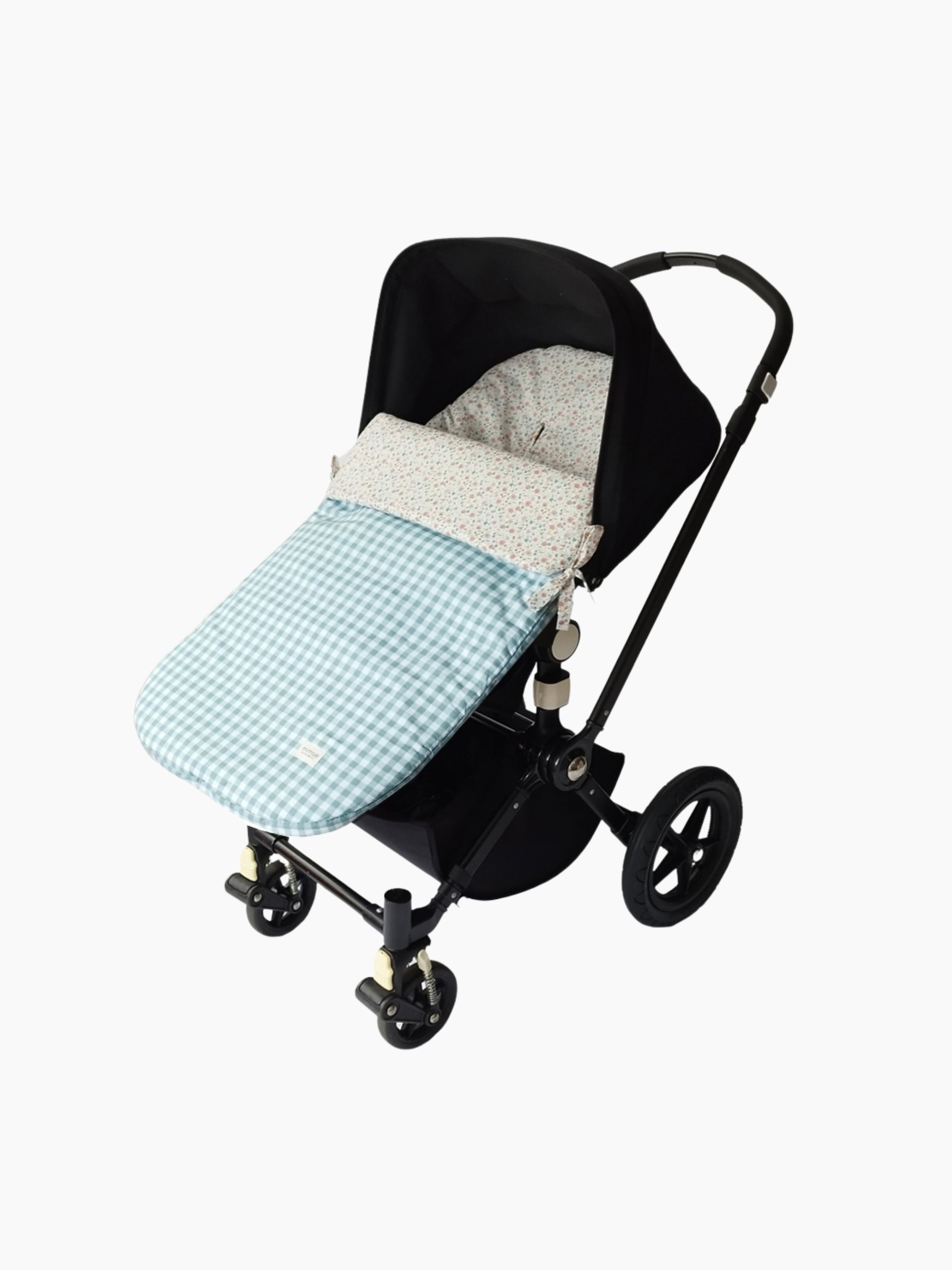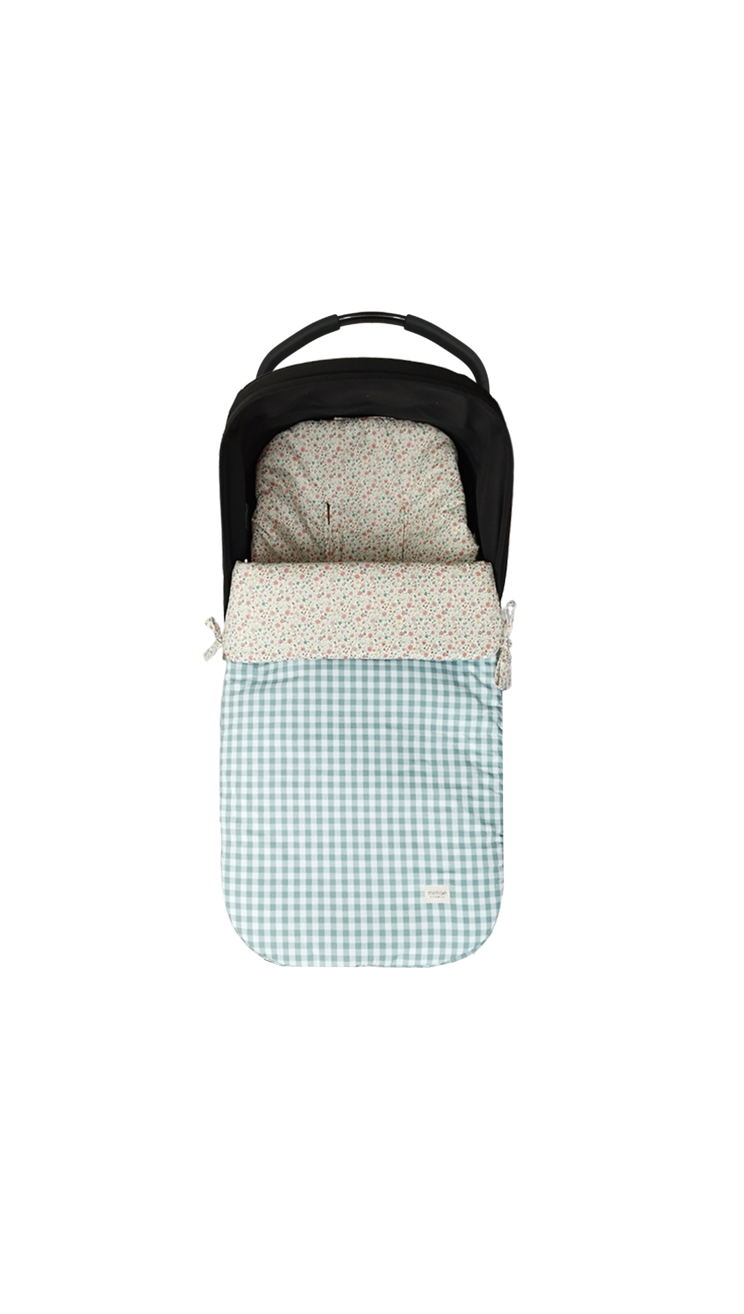 Saco universal para silla de paseo. Acolchado con una guata efecto pluma, el saco es totalmente extraíble mediante 2 cremalleras, para que pueda usarse como colchoneta los meses más cálidos. Parte trasera en Maya 3D, un tejido acolchado y transpirable. Agarre mediante gomas, vueltas y lazos. Confeccionado en Vichy Menta  y  Olivia