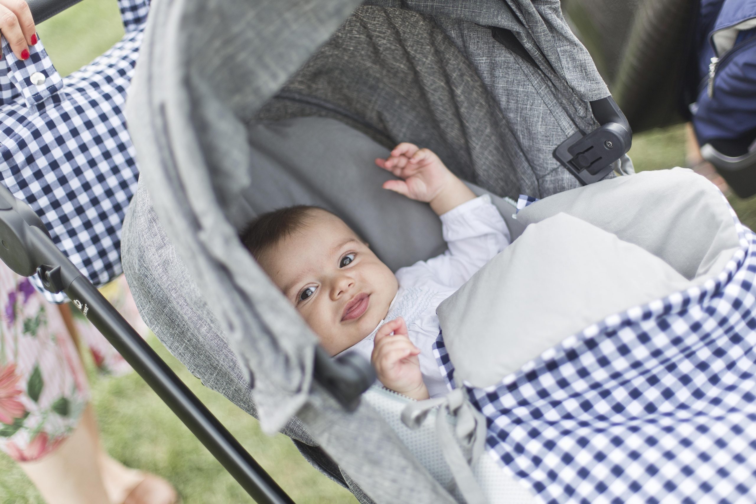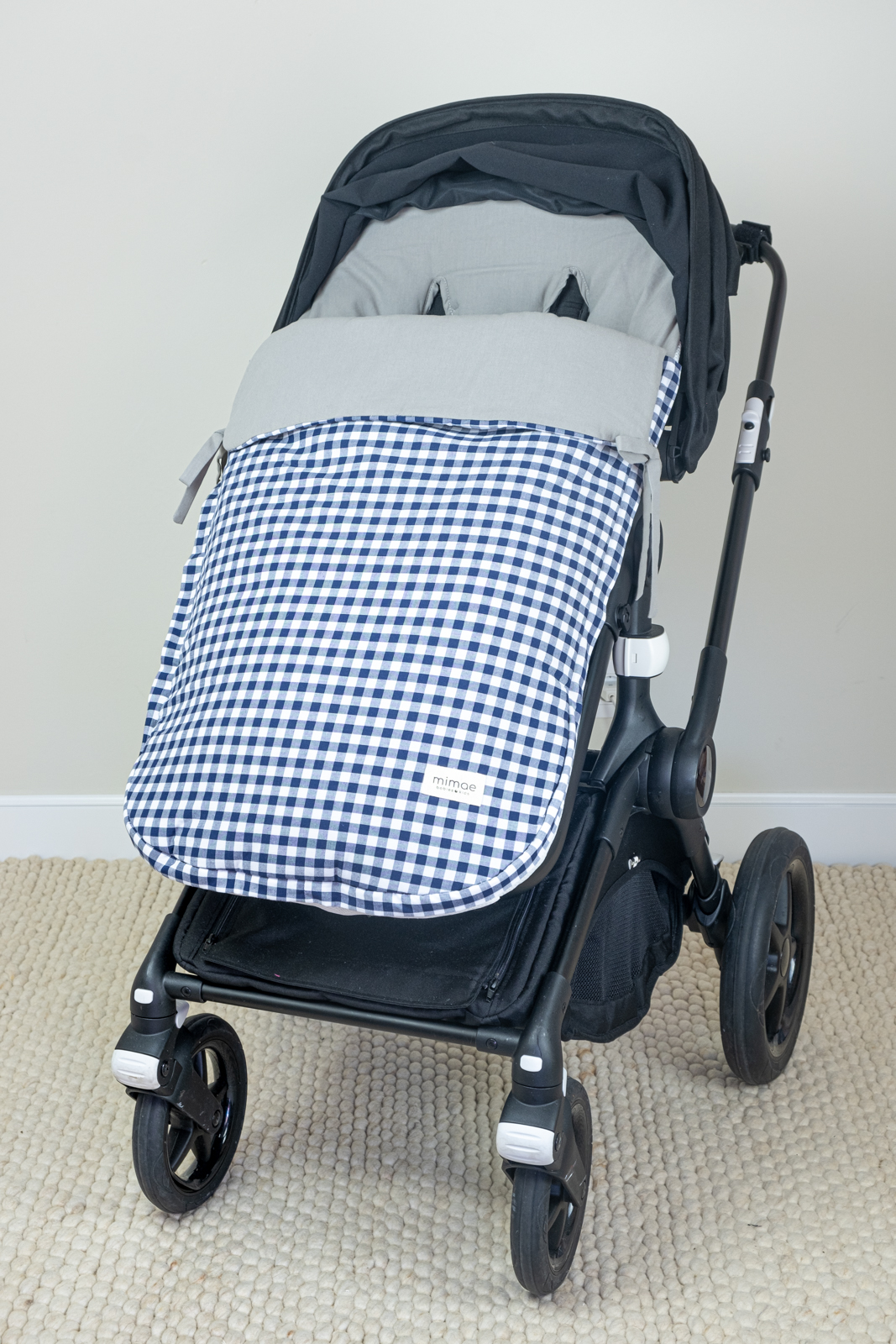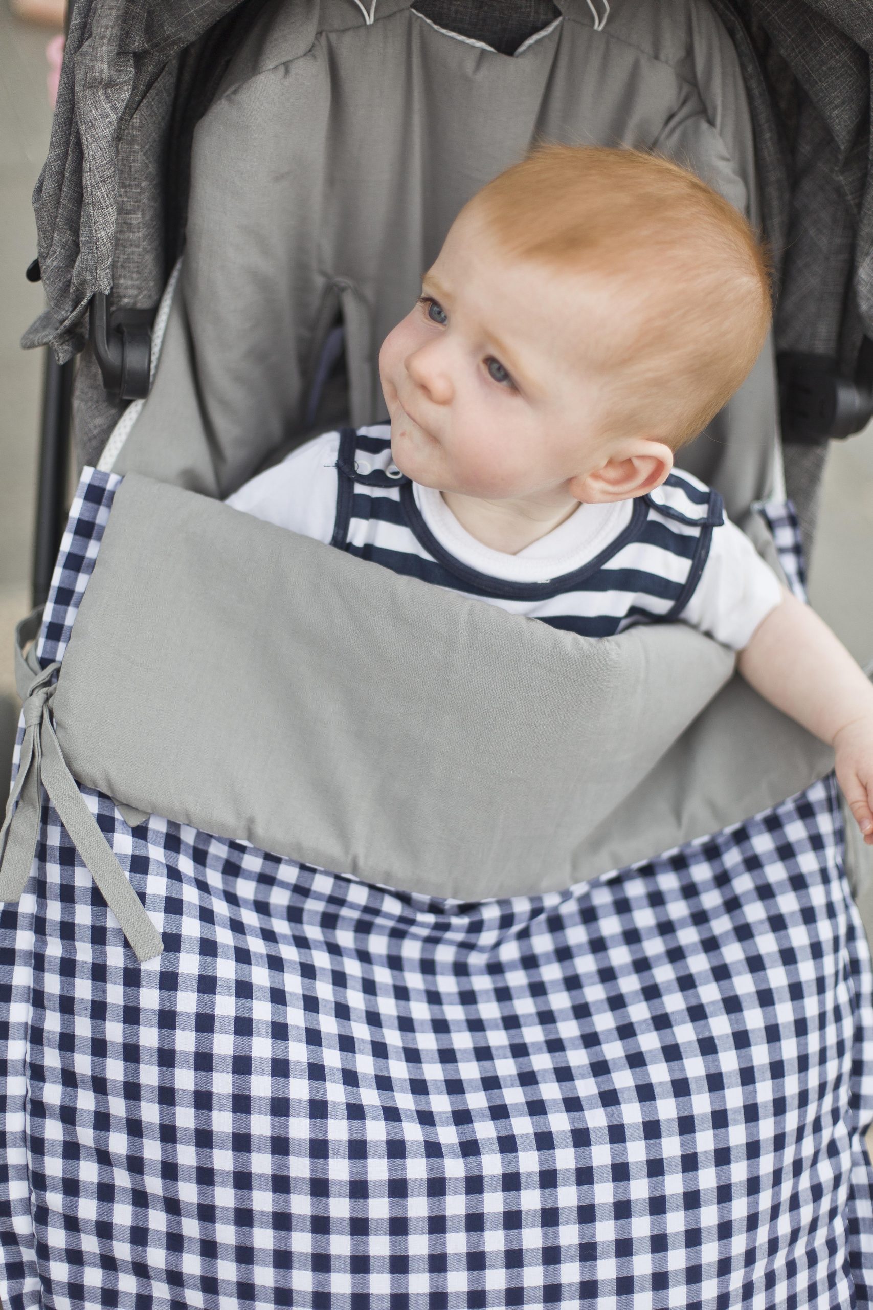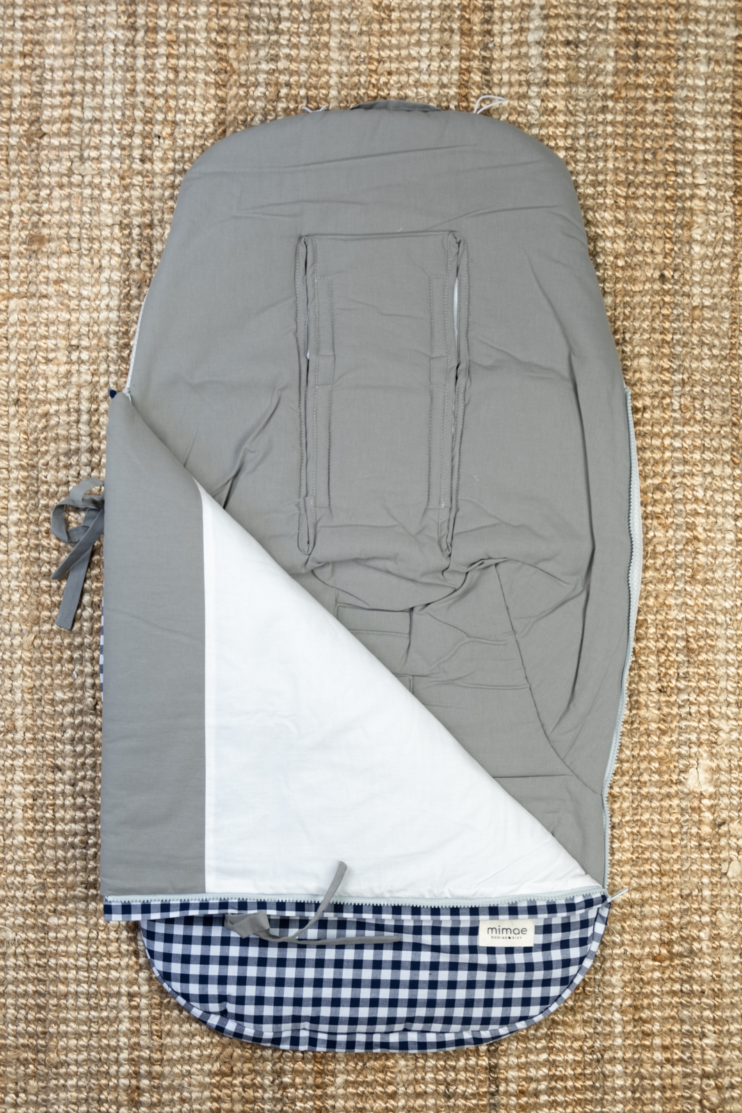 Saco universal para silla de paseo. Acolchado con una guata efecto pluma, el saco es totalmente extraible mediante 2 cremalleras, para que pueda usarse como colchoneta los meses más cálidos. Parte trasera en Maya 3D, un tejido acolchado y transpirable. Agarre mediante gomas, vueltas y lazos. Confeccionado combinando Algodón Liso Gris y Vichy Azul Marino.