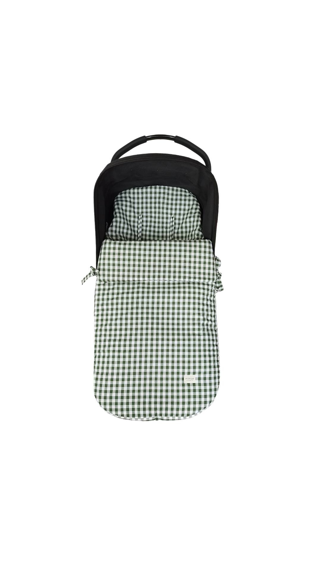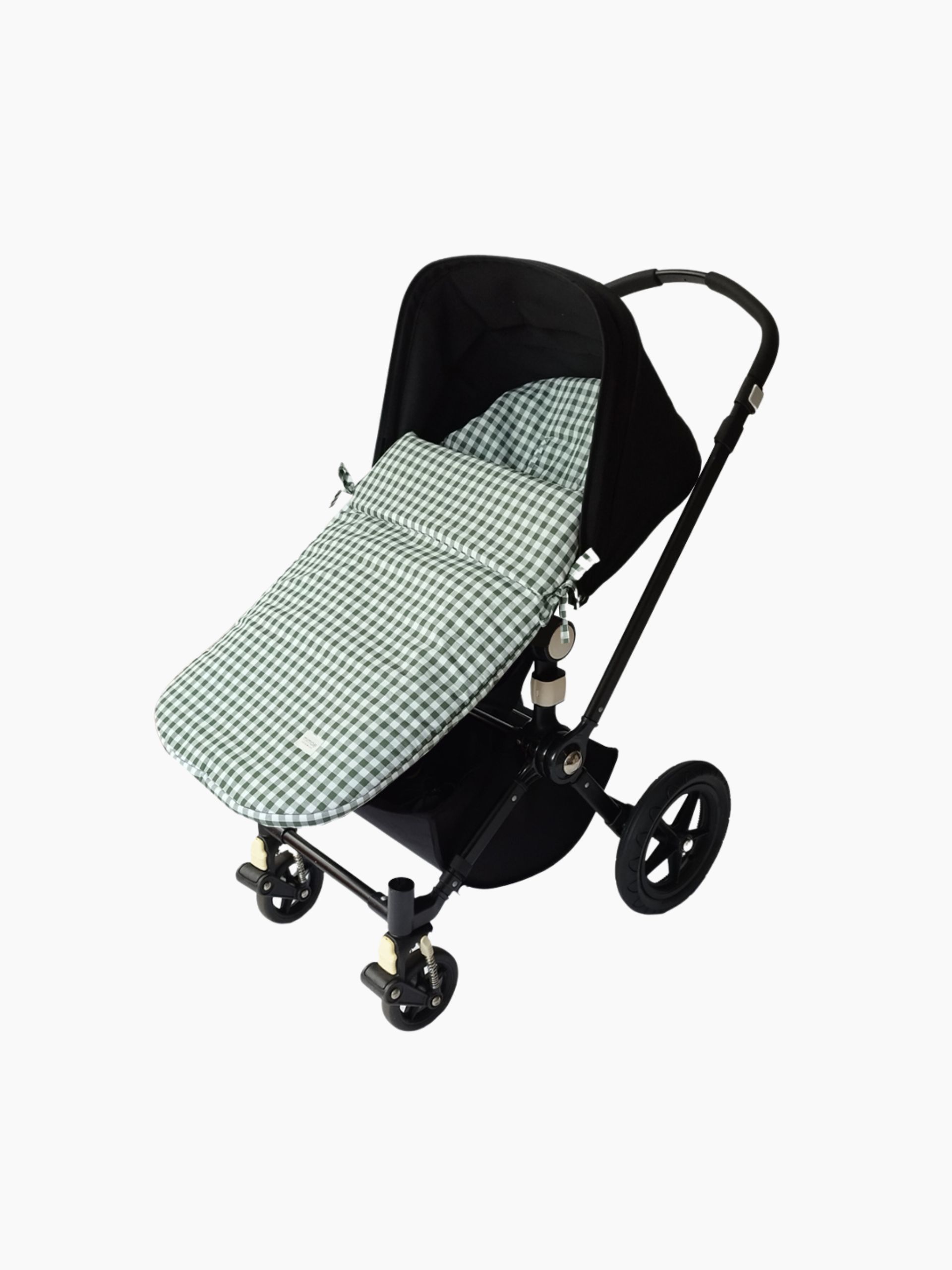Saco universal para silla de paseo. Acolchado con una guata efecto pluma, el saco es totalmente extraíble mediante 2 cremalleras, para que pueda usarse como colchoneta los meses más cálidos. Parte trasera en Maya 3D, un tejido acolchado y transpirable. Agarre mediante gomas, vueltas y lazos. Confeccionado en Vichy Verde
