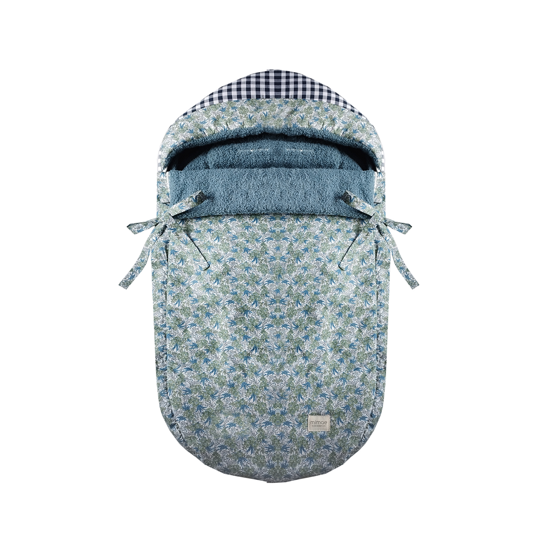 Saco para sillas de paseo ligeras tipo Yoyo, Maclaren… Acolchado con guata efecto pluma, el saco exterior es totalmente extraíble para usarlo como colchoneta. Parte trasera con un tejido de borrego super suave y abrigado, perfecto para los meses mas fríos. Sistema de enganche optimo para sillas ligeras y ojales para pasar los arneses. Confeccionado combinando Liberty Iñaki, Vichy Navy y Borrego Azul.