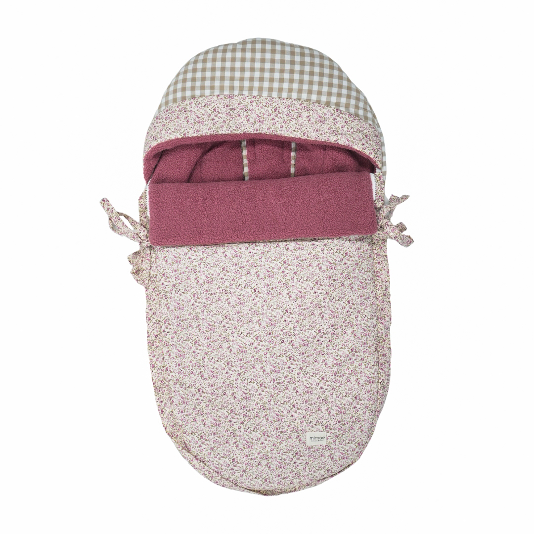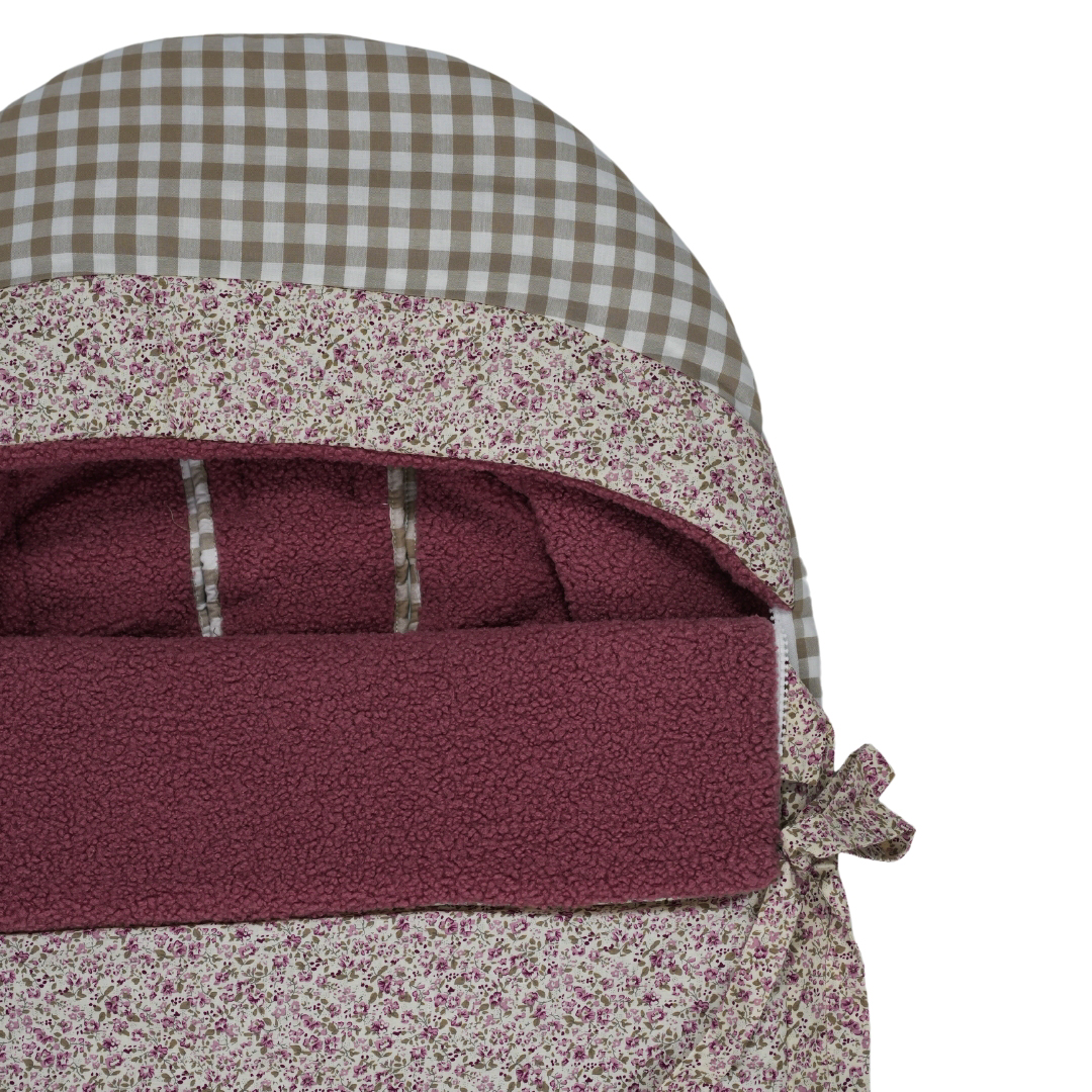 Saco para sillas de paseo ligeras tipo Yoyo, Maclaren… Acolchado con guata efecto pluma, el saco exterior es totalmente extraíble para usarlo como colchoneta. Parte trasera con un tejido de borrego super suave y abrigado, perfecto para los meses mas fríos. Sistema de enganche optimo para sillas ligeras y ojales para pasar los arneses. Confeccionado combinando Liberty Nikole, Vichy Beige y Borrego Rosa