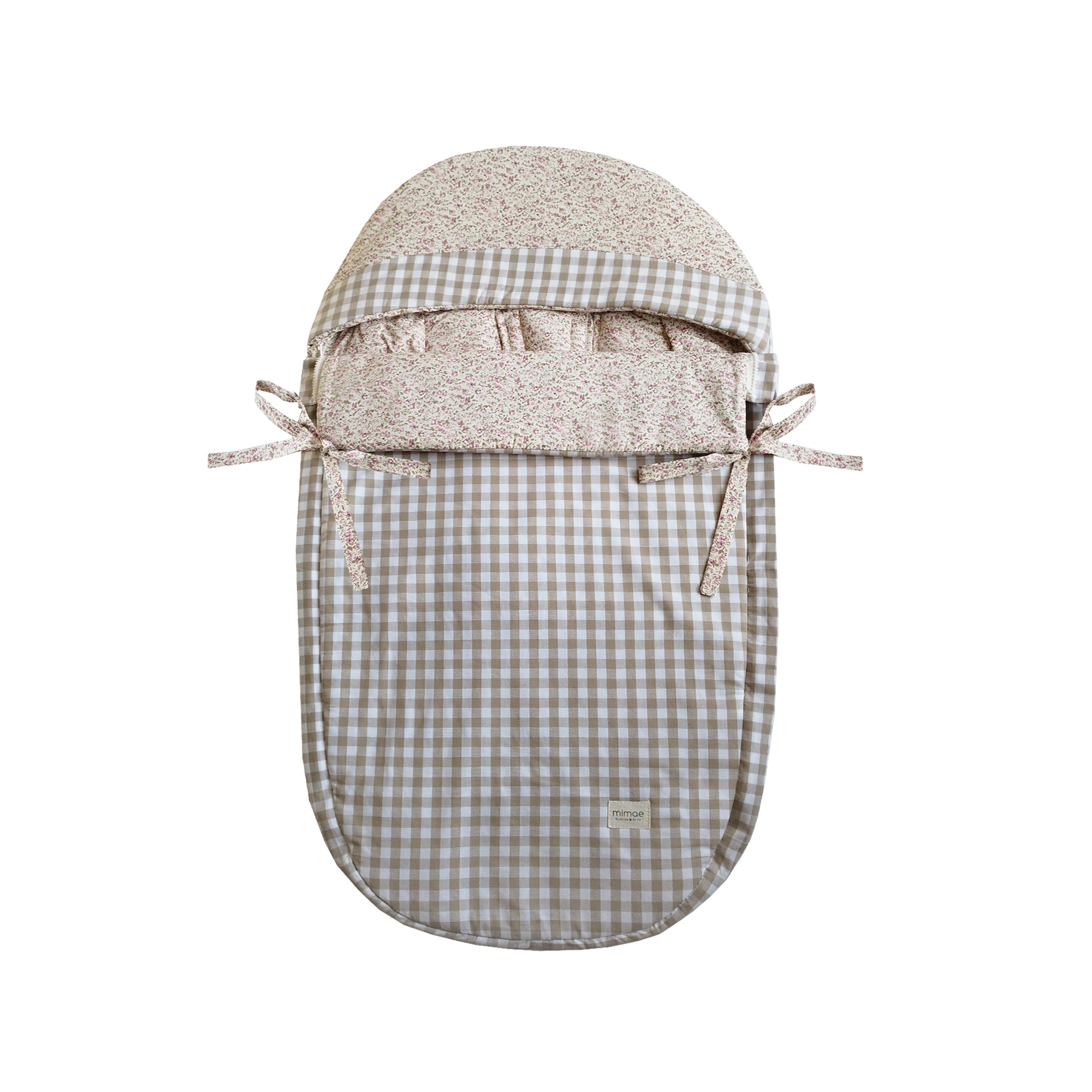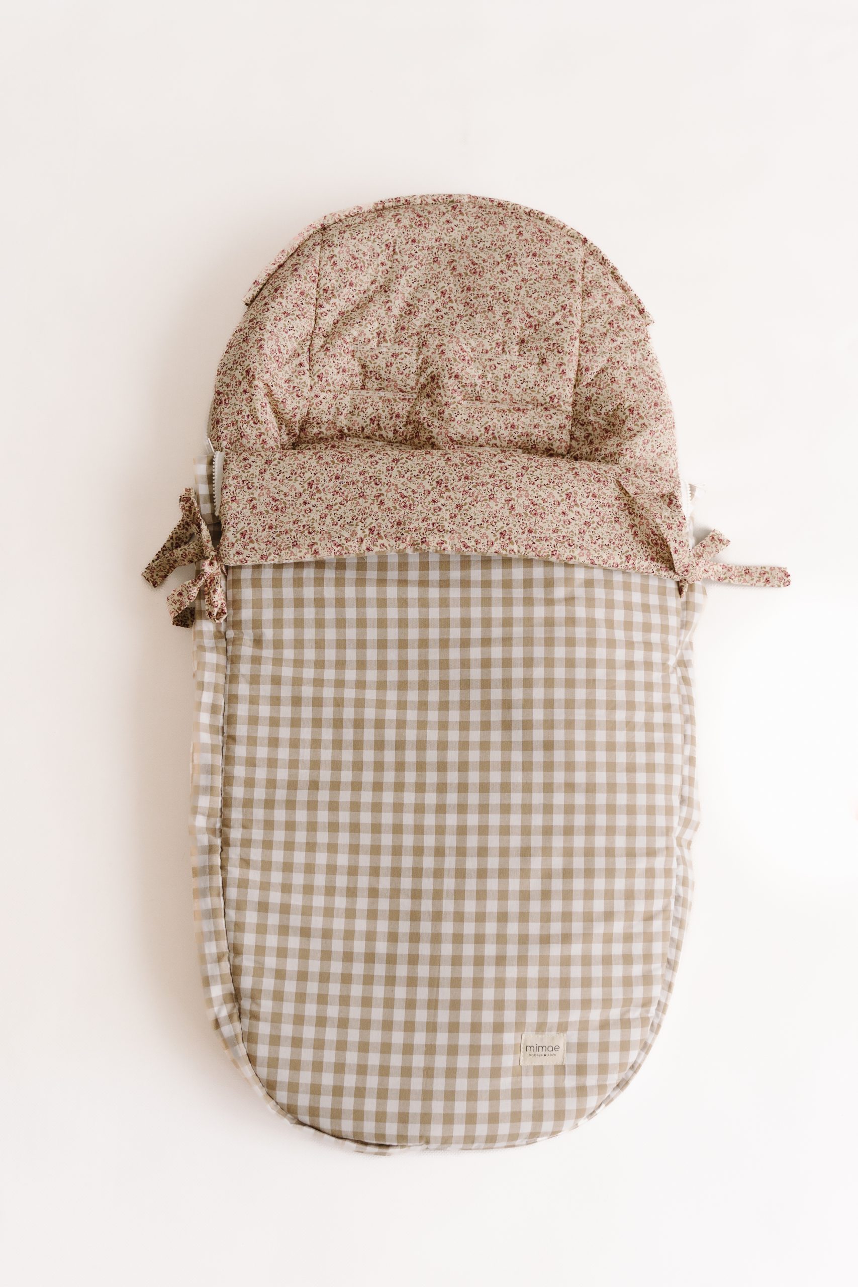 Saco par sillas de paseo ligeras tipo Yoyo, Maclaren… Acolchado con guata efecto pluma, el saco exterior es totalmente extraible para usarlo como colchoneta. Parte trasera en algodón 100%. Sistema de enganche optimo para sillas ligeras y ojales para pasar los arneses. Confeccionado combinando Liberty Nikole y Vichy Beige.