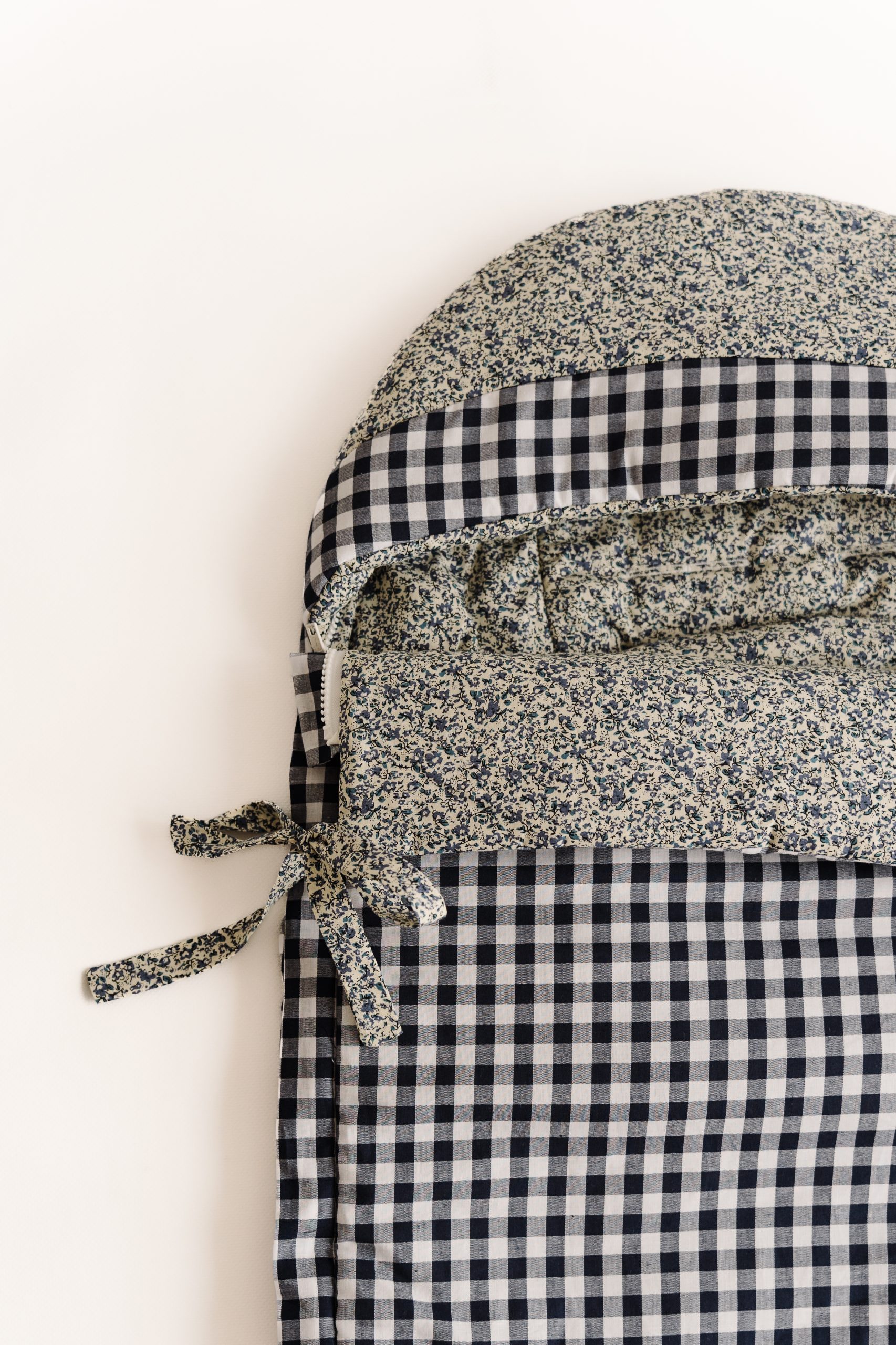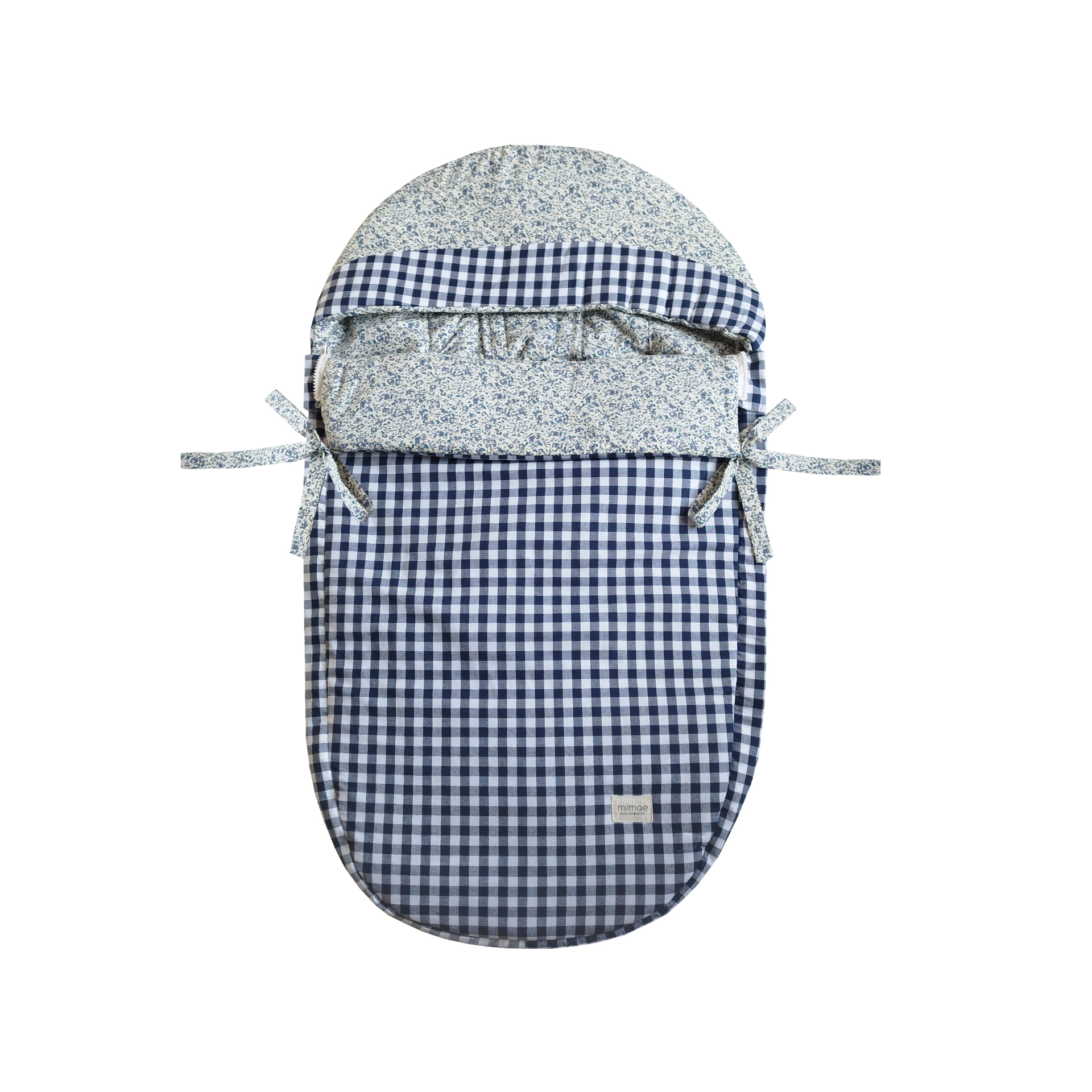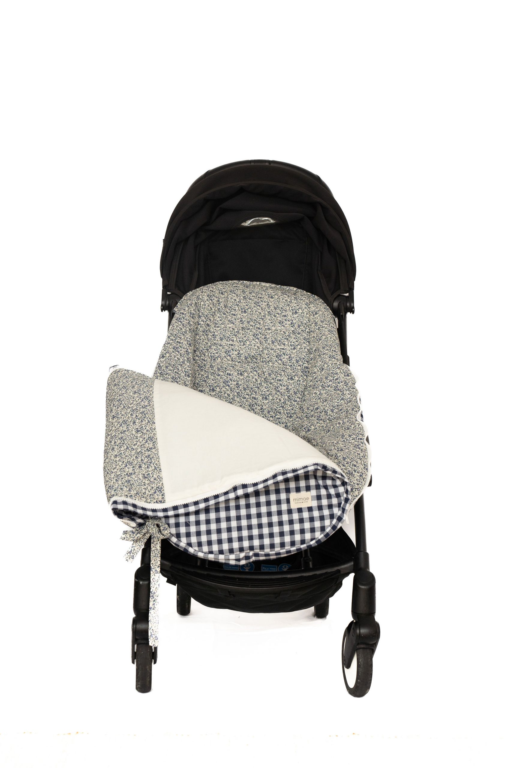 Saco par sillas de paseo ligeras tipo Yoyo, Maclaren… Acolchado con guata efecto pluma, el saco exterior es totalmente extraible para usarlo como colchoneta. Parte trasera en algodón 100%. Sistema de enganche optimo para sillas ligeras y ojales para pasar los arneses. Confeccionado combinando Liberty Paul y Vichy Navy.