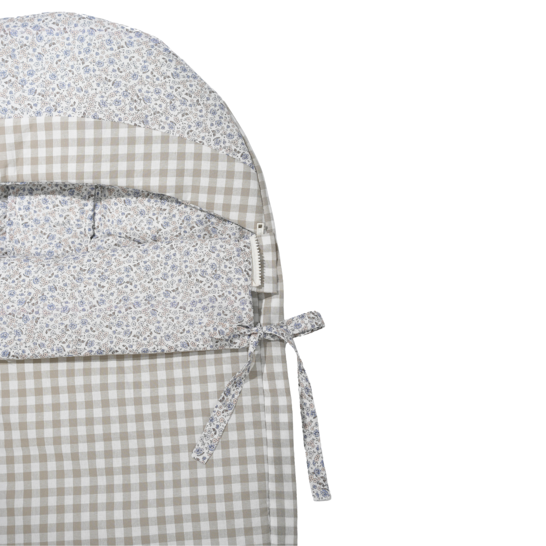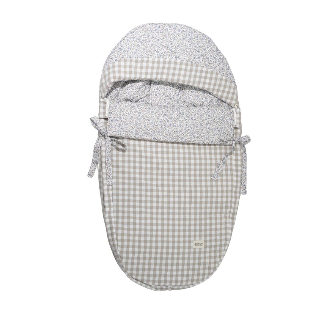 Saco par sillas de paseo ligeras tipo Yoyo, joolz Aer… Acolchado con guata efecto pluma, el saco exterior es totalmente extraible para usarlo como colchoneta. Parte trasera en algodón 100%. Sistema de enganche optimo para sillas ligeras y ojales para pasar los arneses. Confeccionado combinando estampado Luken y vichy beige.